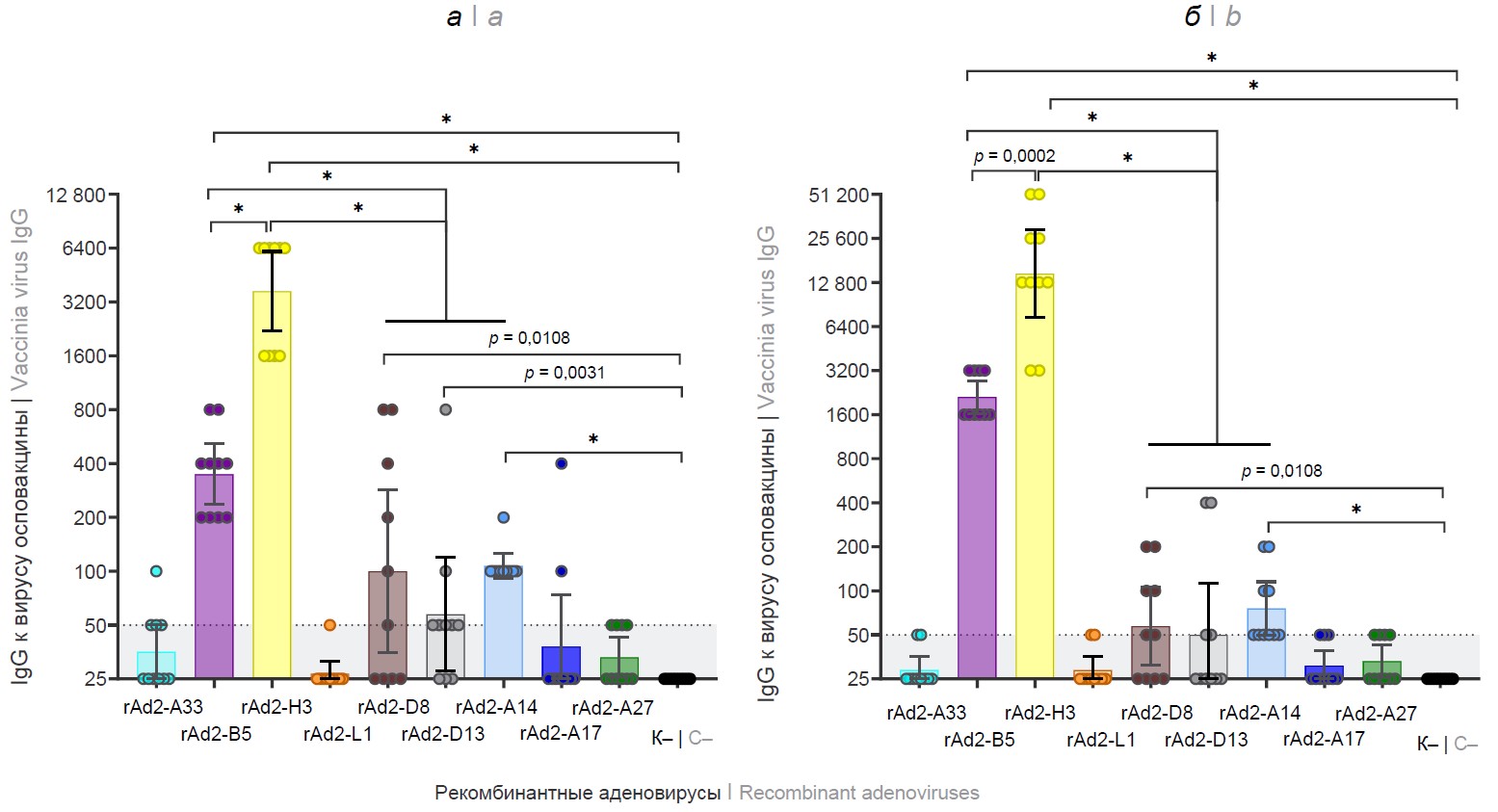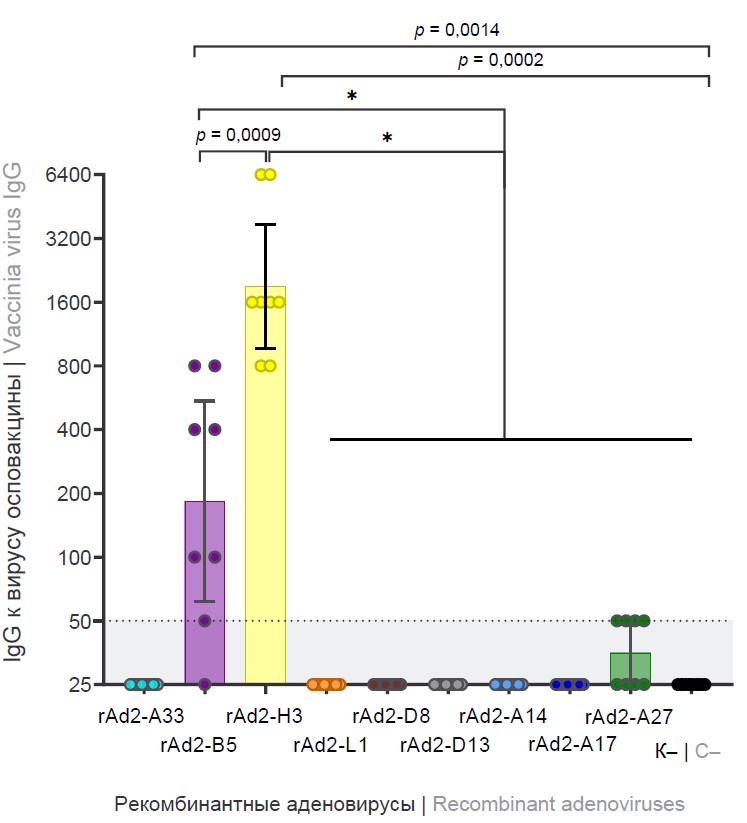 Materials and methods . Recombinant human adenoviruses type 2 (rAd2) carrying surface antigens of vaccinia virus were obtained using homologous recombination in bacteria, followed by adenoviral particle assembly in HEK293 cells. The immunogenic and protective properties of these adenoviruses were tested in BALB/c mice. The presence of antibodies to the vaccinia virus was assessed using ELISA, and survival rates were evaluated in a lethal infection model after intranasal challenge with the vaccinia virus strain Western Reserve.