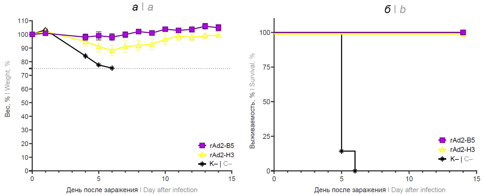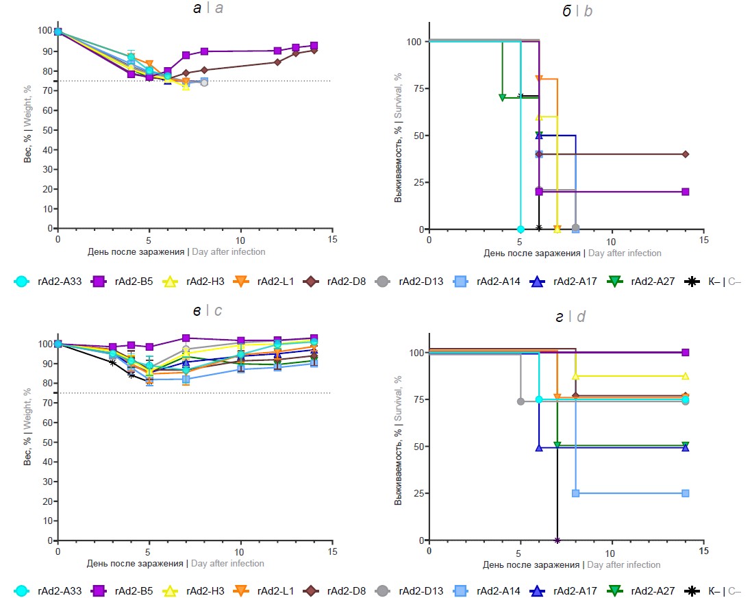 After intramuscular immunization with rAd2-B5 expressing the B5 EEV glycoprotein gene, we observed 20% protection of animals from lethal infection (Fig. 4, a, b). Double intramuscular immunization with rAd2-D8 expressing the D8 IMV glycoprotein gene resulted in 40% survival of animals. Animals immunized with rAd2 expressing other surface antigens lost 25% of their initial weight within 5–7 days of infection. The results of the study concluded that when using the intramuscular route of administration, a single antigen is not sufficient for protection.