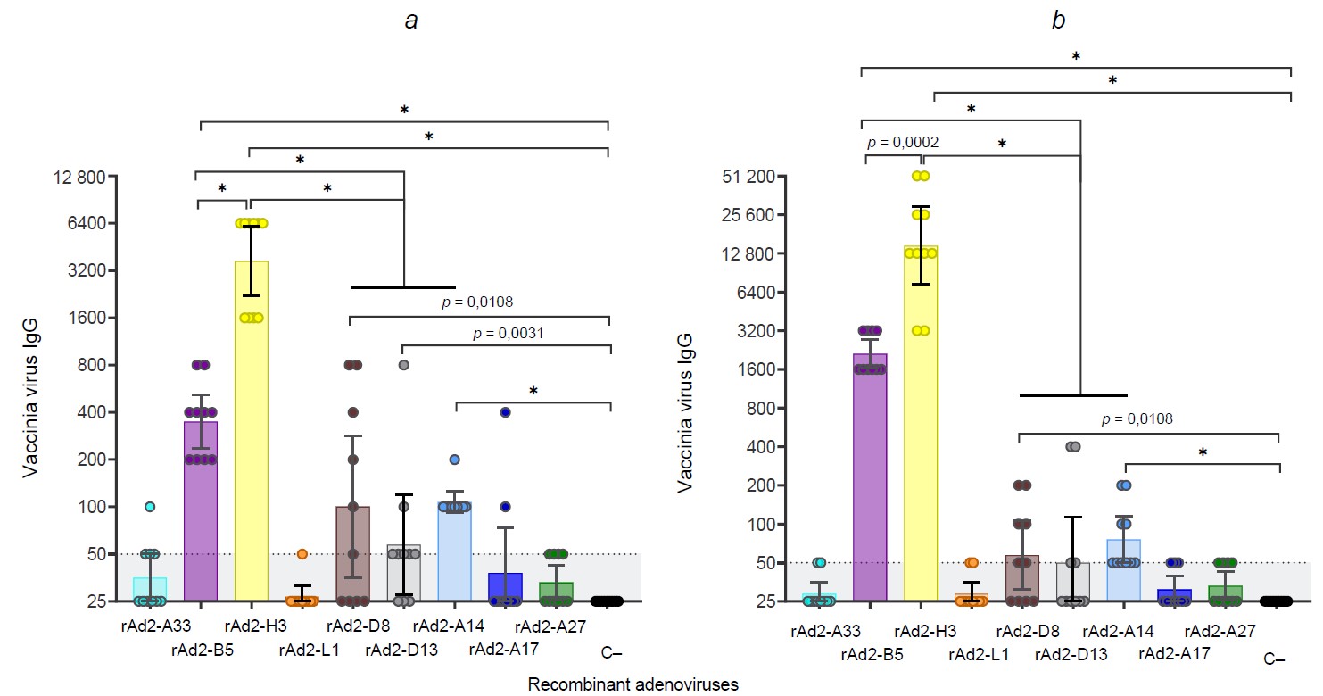 To evaluate the immunogenicity of the obtained rAd (rAd2-A33, rAd2-B5, rAd2-H3, rAd2-L1, rAd2-D8, rAd2-D13, rAd2-A14, rAd2-A17, rAd2-A27), mice were immunized intramuscularly or intranasally with adenoviruses at a dose of 2 × 1010 viral particles once or twice. Titers of specific IgG antibodies to vaccinia virus were determined by enzyme-linked immunosorbent assay on the 28th day after immunization (Figs. 2, 3).