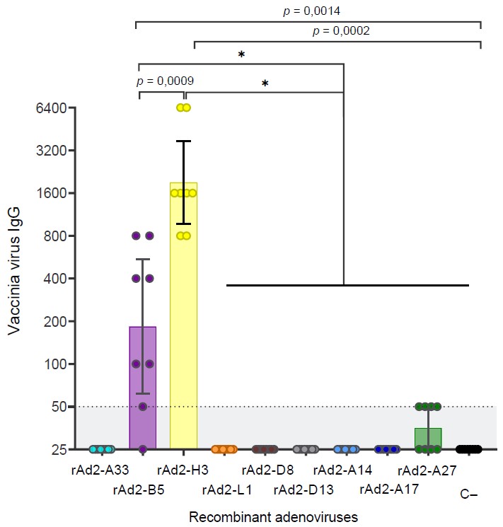 Fig. 3. Immunogenicity of recombinant adenoviruses expressing surface antigens of the vaccinia virus after two intranasal immunizations.