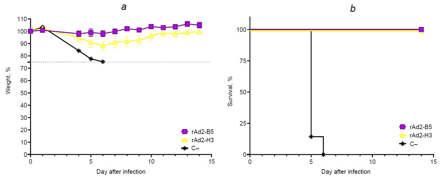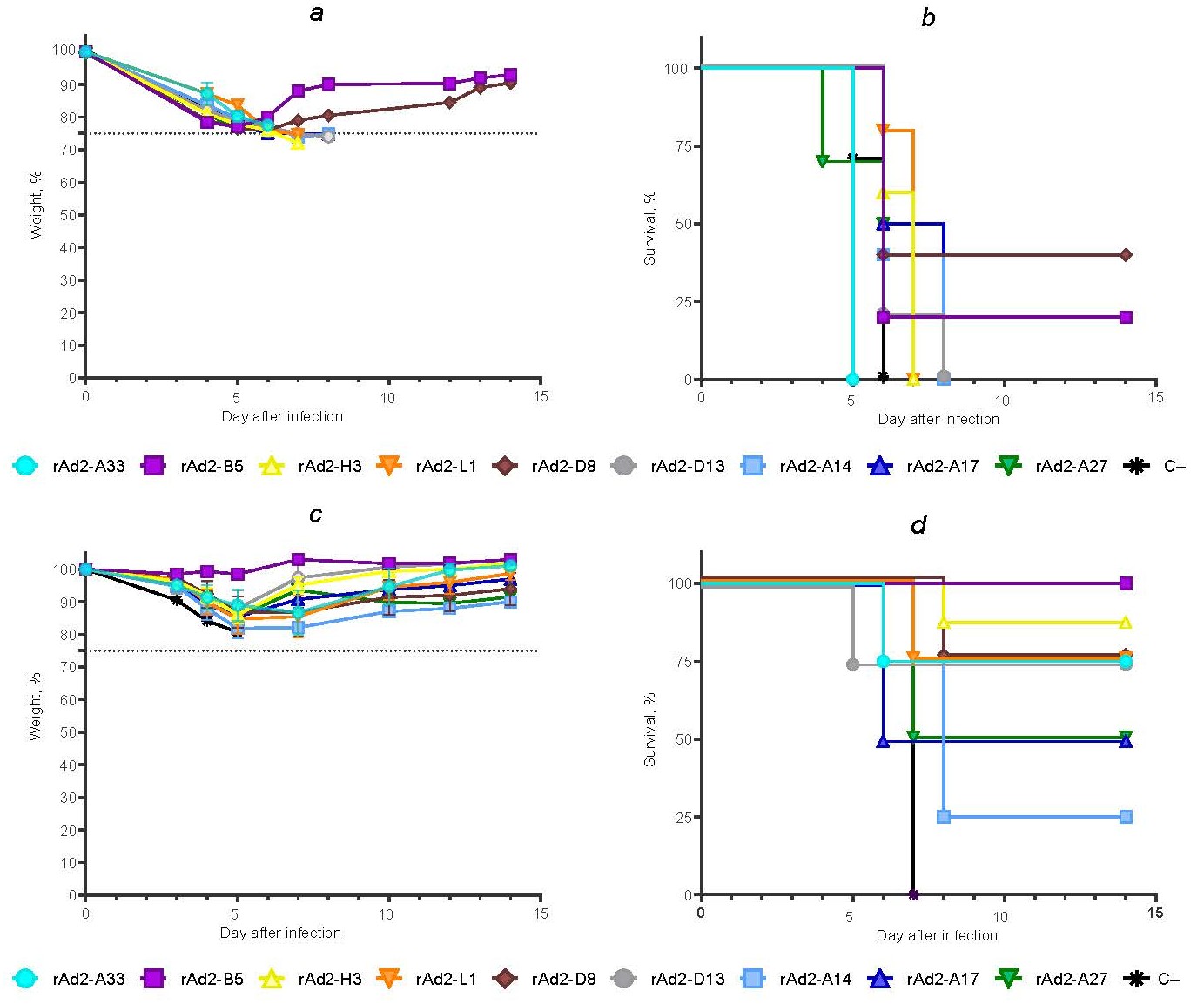 In particular, during immunization with rAd2-B5 we observed 100% protective efficacy. It should be noted that in the group of animals immunized with rAd2-B5, insignificant weight loss (no more than 3%) on days 3-5 was observed in only half of the animals. In the rAd2-H3 group, the survival rate was 87.5% (out of the 8 mice, 1 did not survive). Furthermore, 1 mouse had a weight loss of about 15% on day 5 with gradual recovery by day 14. In the rAd2-A33, rAd2-L1, rAd2-D8 and rAd2-D13 groups, the survival rate was 75%. Temporary weight loss by day 5 for the groups did not exceed 25%. The mice in the rAd2-A17 and rAd2-A27 groups had a 50% lethality with a weight loss of 15% or less. The mice immunized with rAd2-A14 lost 21% of their initial weight within 5 days of infection. The survival rate in this group was only 25%.