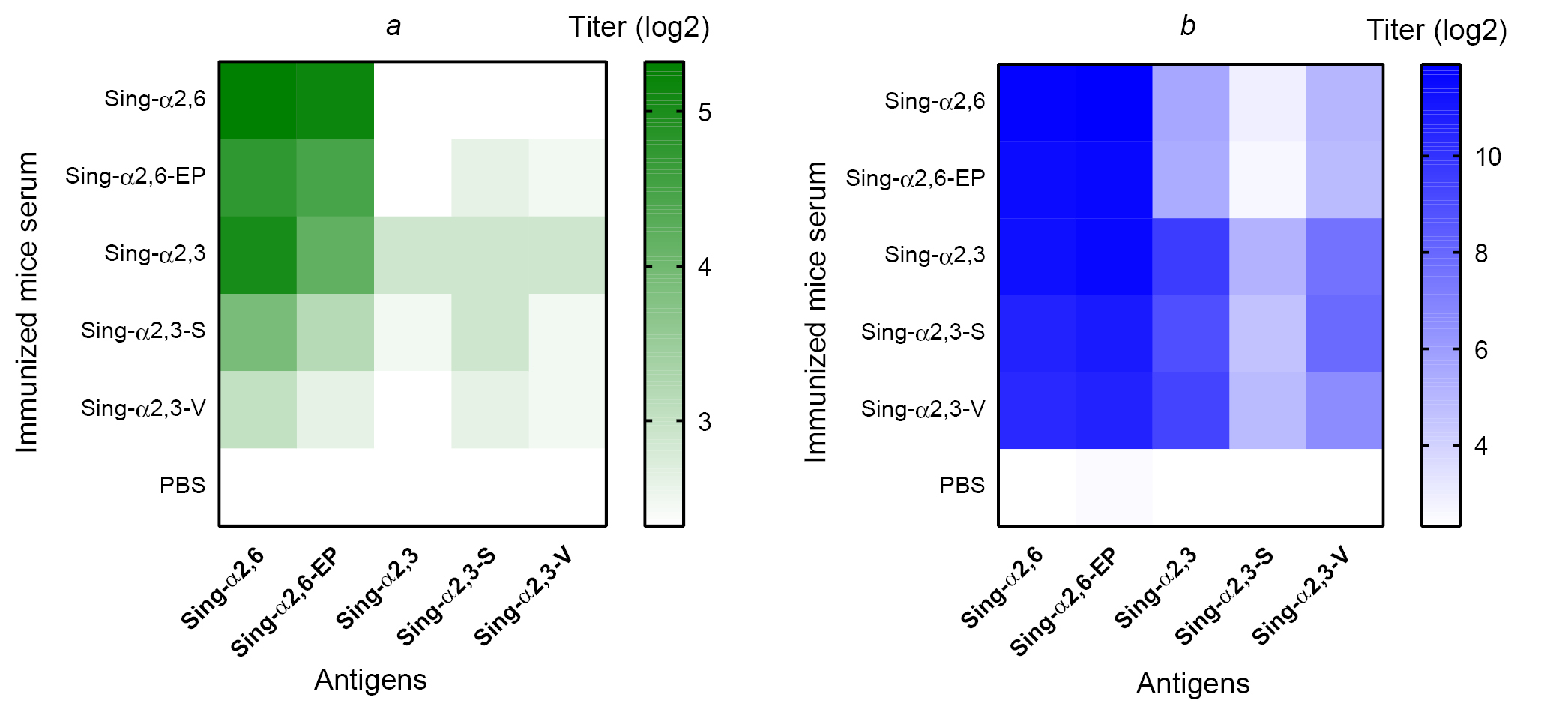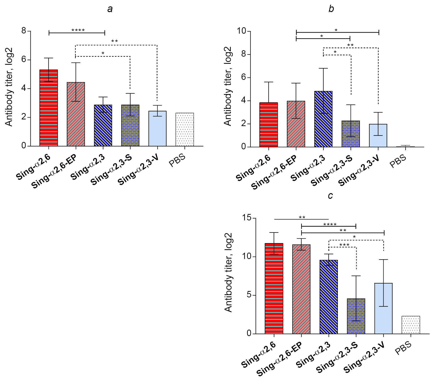 Twofold immunization of Syrian hamsters with reverse-genetic vaccine strains 17/Sing-α2,3 and 17/Sing-α2,6 resulted in similar levels of serum IgG antibodies, binding to the Sing-α2,3 antigen, with the 17/Sing-α2,3 vaccine virus inducing significantly more antibodies to the Sing-α2,6 antigen than to its own Sing-α2,3 antigen (Fig. 5). The results obtained are in full compliance with the results of studying the antigenicity of pandemic variants of A/Singapore/1/57 in an experiment on mice (Fig. 3).