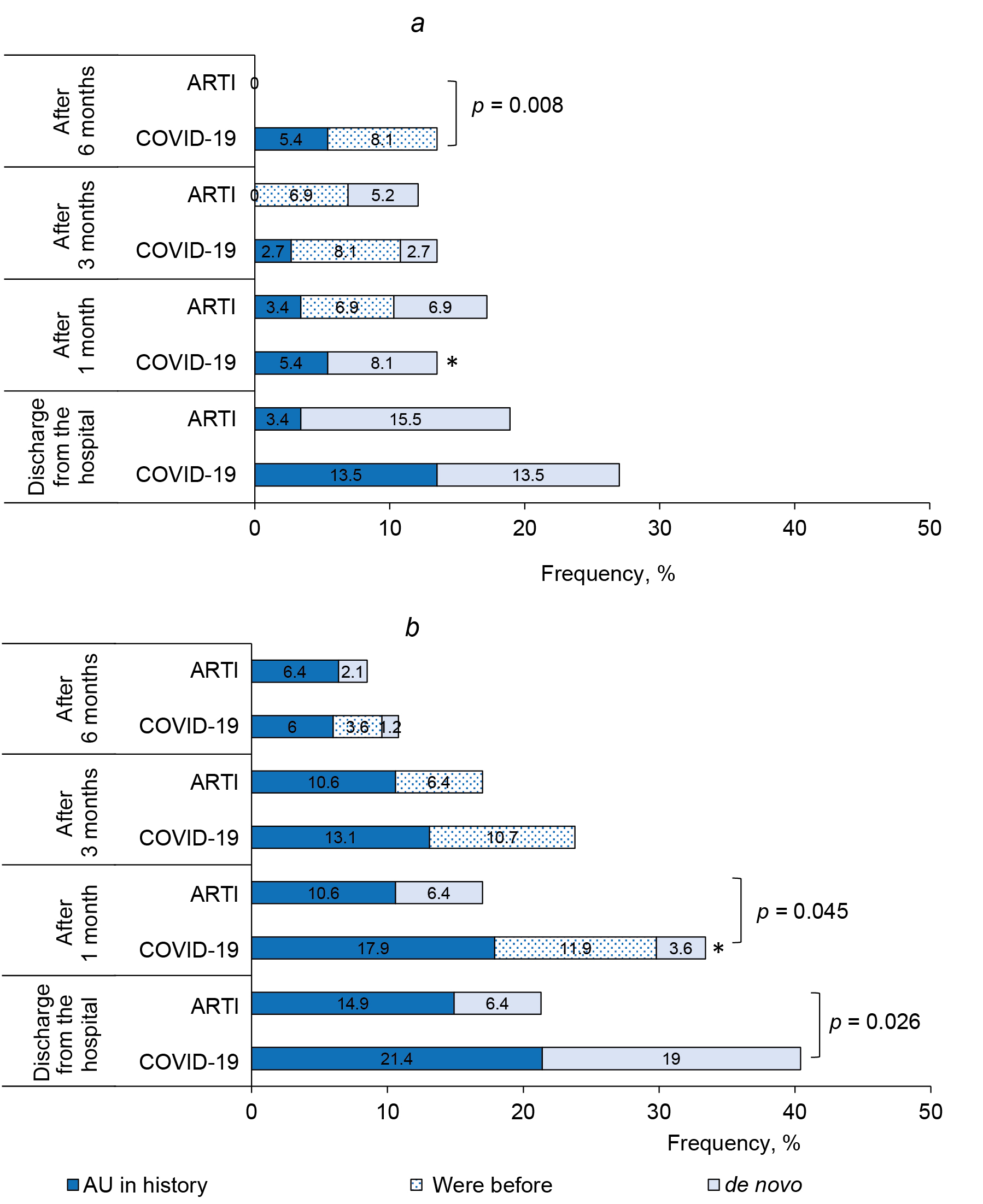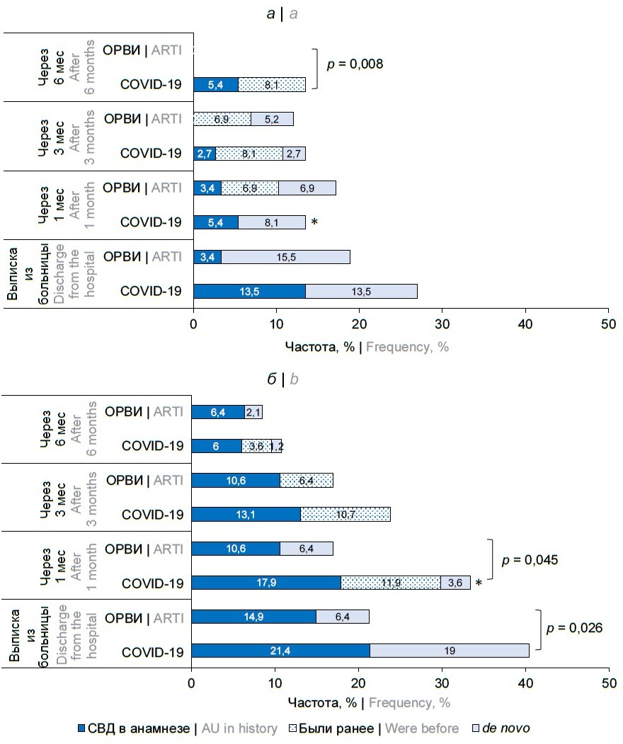 Общая частота случаев, соответствующих определению РСС, у детей < 6 лет через 1, 3, 6 и 12 мес после выписки из больницы была относительно стабильной и составила после COVID-19 — 19, 24, 30 и 16%, после ОРВИ — 19, 24, 24 и 15,5% (во всех точках р > 0,05). Но после исключения пациентов, болевших острыми инфекциями или другими установленными заболеваниями, оказалось, что РСС регистрировалось de novo редко — 2,7–8,1% через 1–3 мес после выписки из больницы, и отсутствовало через 6 мес (рисунок, а).