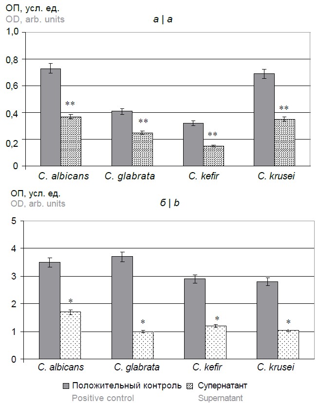 Установлено ингибирующее действие супернатанта E. faecium 18 на рост грибов рода Candida всех исследуемых видов. В положительном контроле уровень ОП суточной бульонной культуры грибов у C. albicans составлял 0,73 ± 0,02; у C. glabrata — 0,41 ± 0,01; у C. kefir — 0,32 ± 0,01; у C. krusei — 0,69 ± 0,02, а при добавлении супернатанта снижался до 0,37 ± 0,01; 0,25 ± 0,01; 0,15 ± 0,01; 0,35 ± 0,02 КОЕ/мл соответственно (рис. 1, а).