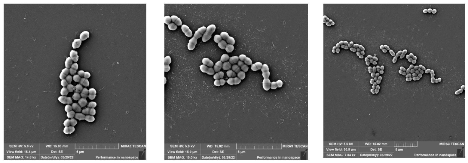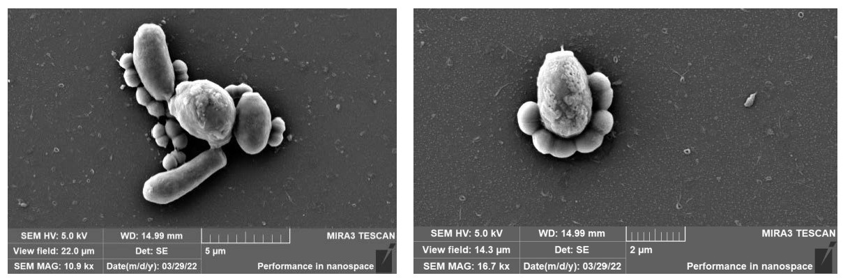 Подготовку образцов для сканирующей электронной микроскопии (СЭМ) проводили следующим образом: взвеси культуры энтерококка и взвеси культуры энтерококка с тест-штаммами грибов в физиологическом растворе в концентрации 109 КОЕ/мл трижды отмывали 0,1 М фосфатно-буферным раствором Соренсена («ЛидерМед Групп») и добавляли 400 мкл 2,5% глутарового альдегида к последнему осадку. Образцы инкубировали в течение 24 ч при 4ºС и вновь отмывали 0,1 М фосфатно-буферным раствором, обезвоживали водно-этанольными растворами с возрастающими концентрациями (20, 40, 60, 80 и 90% и 2 цикла 100%) и наносили на покровные стекла. Время инкубации в каждом растворе составляло15 мин при комнатной температуре. Покровные стекла с образцами высушивали в критической точке «Quorum K850 Critical Point Dryer» («Quorum Technologies Ltd.»), прикрепляли двусторонним скотчем к столику СЭМ и напыляли золотом с помощью установки ионно-плазменного напыления «Quorum Q150R S plus» («Quorum Technologies Ltd.»). СЭМ проводили на сканирующем электронном микроскопе «Tescan Mira 3» («Tescan Brno») Центра коллективного пользования образовательного Центра выявления и поддержки одарённых детей «Гагарин» (Оренбург).