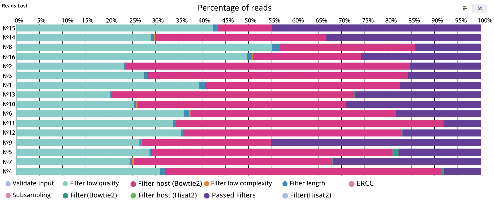 The number of reads satisfying the Q20 parameter for the studied samples was 1127–40,969. The GC value for all samples varied in the range of 49.7–52.4%, which corresponds to the exome regions of 16S rRNA gene fragments used for MGS analysis. During the processing of the data obtained, it was found that the highest amount of reads after filtration was obtained for sample No. 13 (93,789,000 K). A reduction in the number of reads was observed for samples Nos. 9 and 14 (29,314,000 K and 28,704,000 K). The total number of reads after the filtering step for the 4 samples (Nos. 2, 5, 7 and 10) ranged between 9,172,000–16,651,000 K. The number of filtered reads for the remaining samples ranged 488–7,633,000 K. The least amount of filtered data (Q < 20) after bioinformatics processing was observed for samples Nos. 4, 8 and 11. The highest number of poor quality data (Q < 20) was obtained for samples Nos. 9, 13, and 14. The result of data quality assessment is shown in Fig. 1.