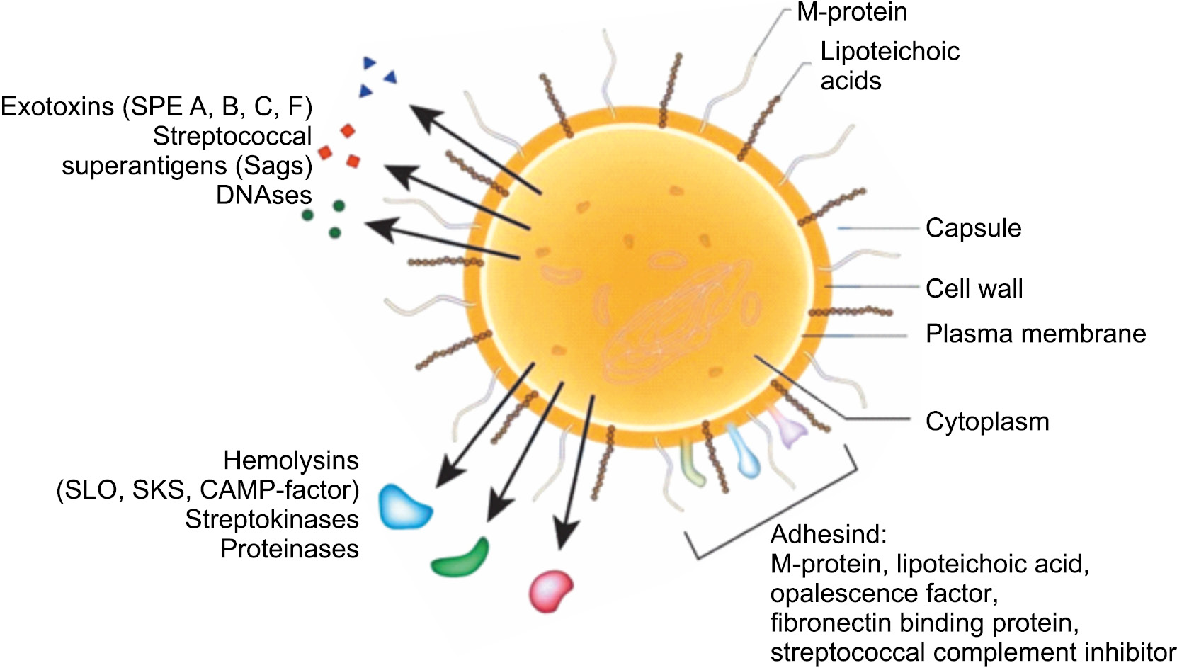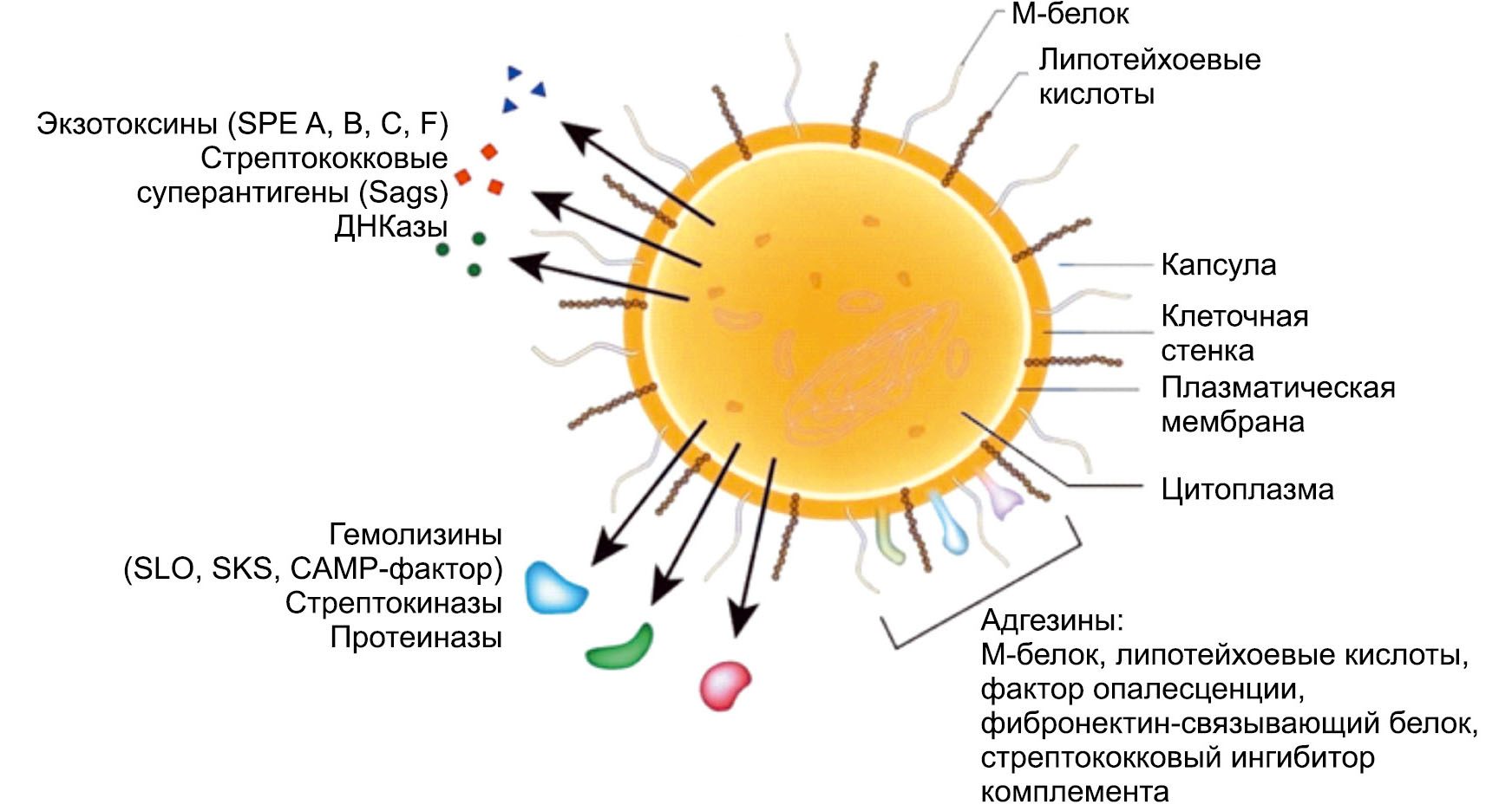 Рис. 2. Структура клетки стрептококка и основных биологически активных продуктов S. pyogenes [19].