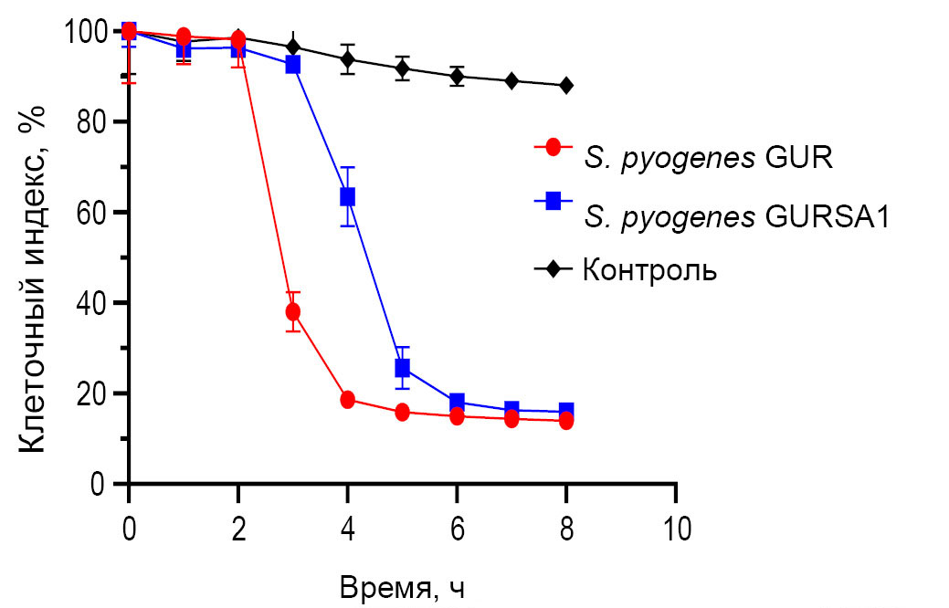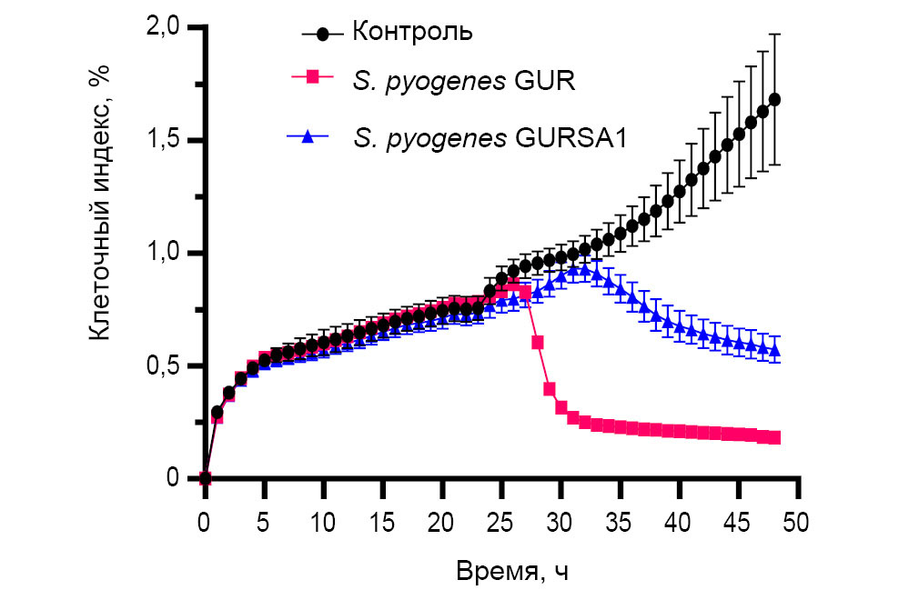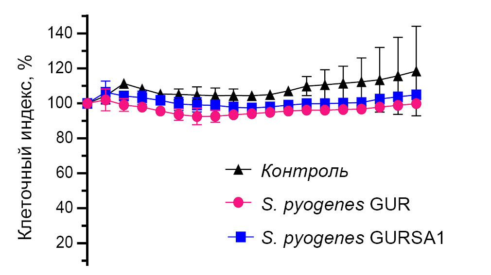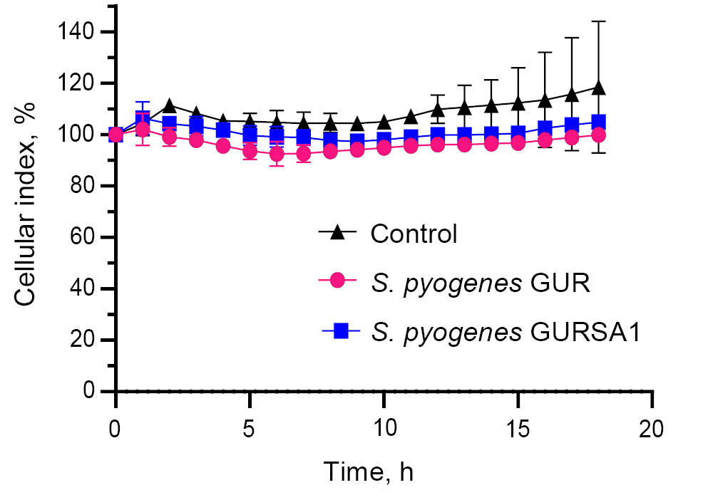 Рис. 3. Влияние штаммов GUR, GURSA1 S. pyogenes на клетки C6 в реальном времени по данным xCELLigence [24].