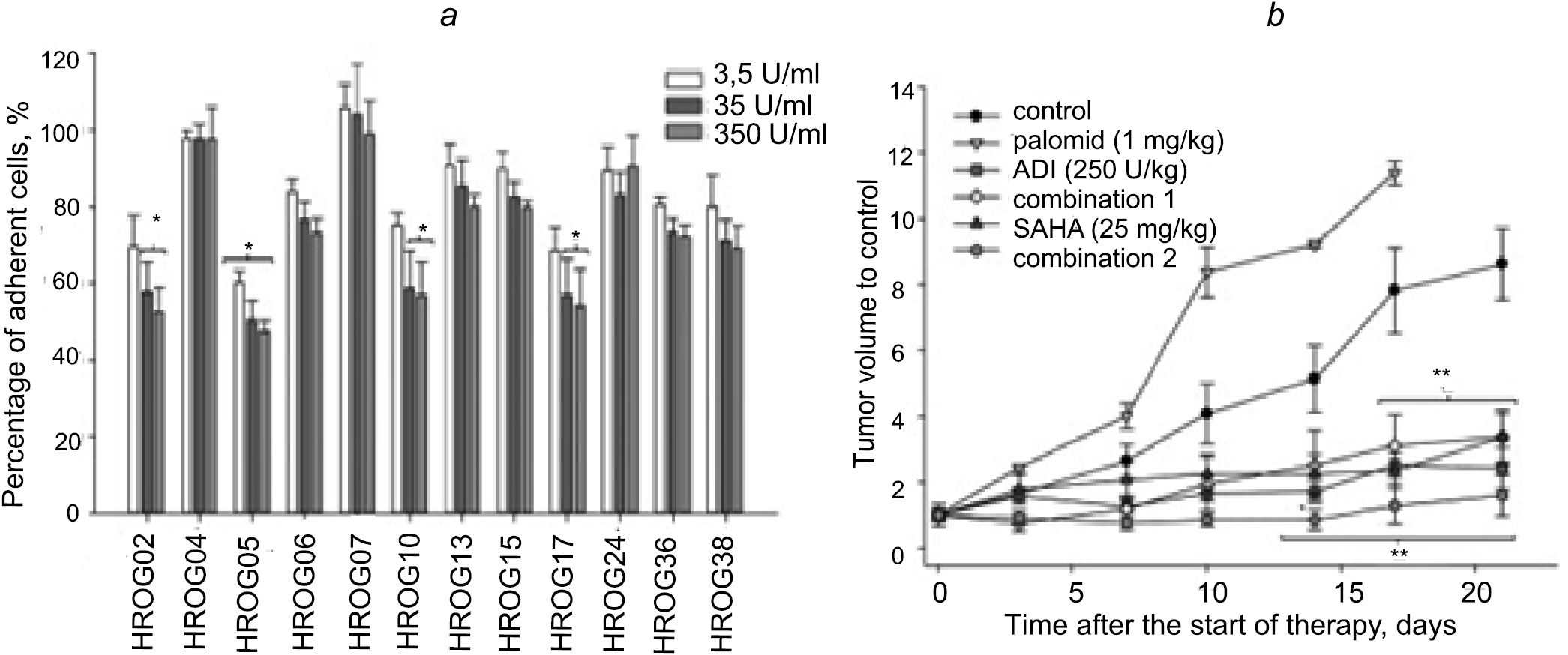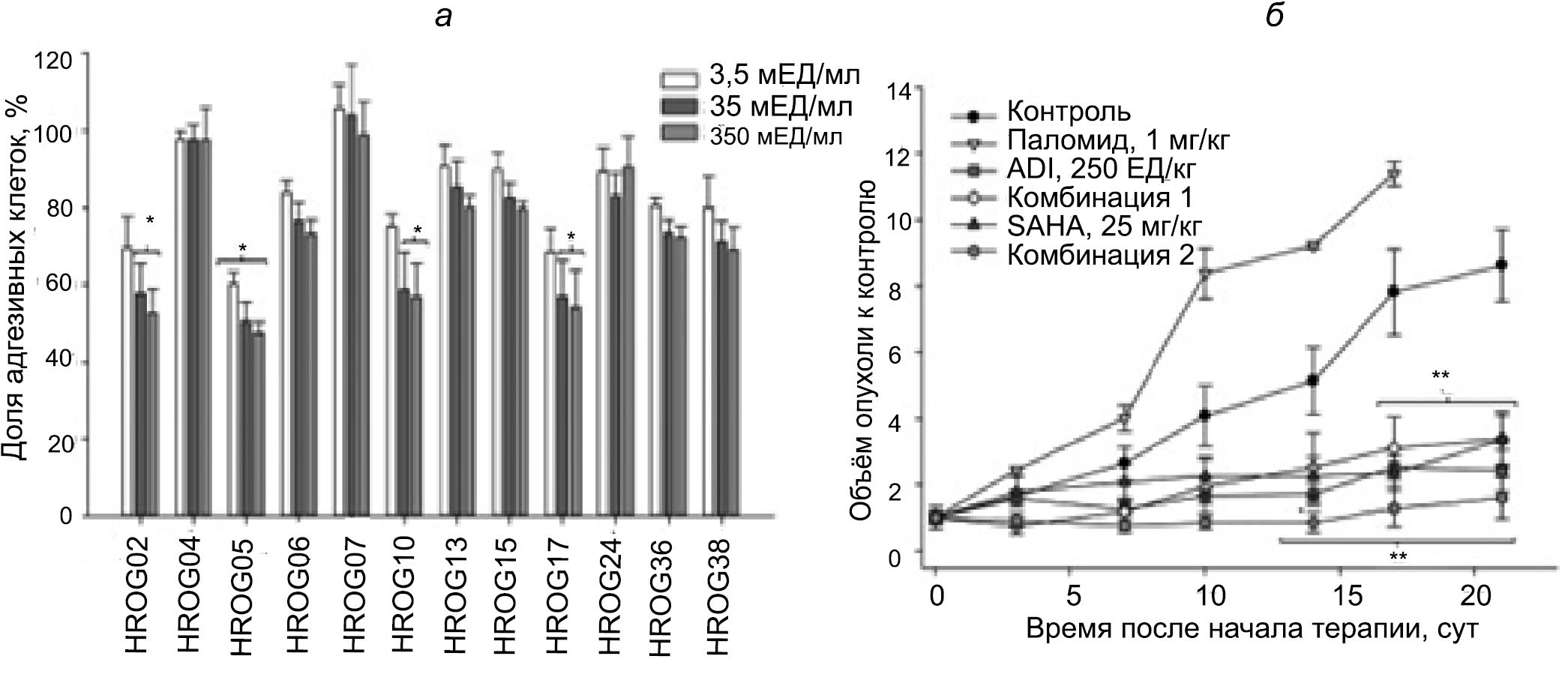 На клеточных линиях, для которых ADI снижала пролиферацию клеток, были протестированы её комбинации с химиопрепаратами. На клетках HROG02, HROG05 и HROG10 66% ГБМ наблюдались синергические эффекты с ингибированием роста до 70% при использовании комбинации ADI с Palomid 529. Аналогичные противоопухолевые эффекты (гибель клеток на 60%) были установлены после добавления хлорохина к ADI. Причиной противоопухолевых эффектов ADI было эпигенетическое подавление генов пути синтеза аргинина (аргининосукцинатсинтетазы ASS1 и аргининосукцинатлиазы ASL). На модели in vivo ADI (250 ЕД/кг массы) и его комбинация с SAHA (25 мг/кг массы) ингибировали на 70% размеры опухоли гетеротрансплантата HROG05 по сравнению с контролем (рис. 9, б) [32].