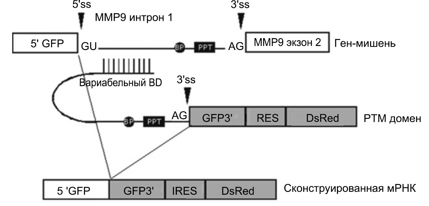 PTM — сконструированная мРНК, связанная через антисмысловой BD домен с интроном 1 гена MMP; BP — точка ветвления; PPT — полипиримидиновая последовательность.
