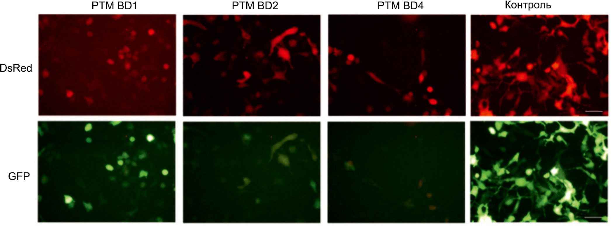 Контроль трансфецирован конструкцией, содержащей метку DsRed и полноразмерный кДНК GFP. Клетки, экспрессирующие GFP, указывают на транс-сплайсинг целевого гена и PTM, содержащего один из трех BD (BD1, BD2 и BD4) доменов. Масштаб 20 мм.