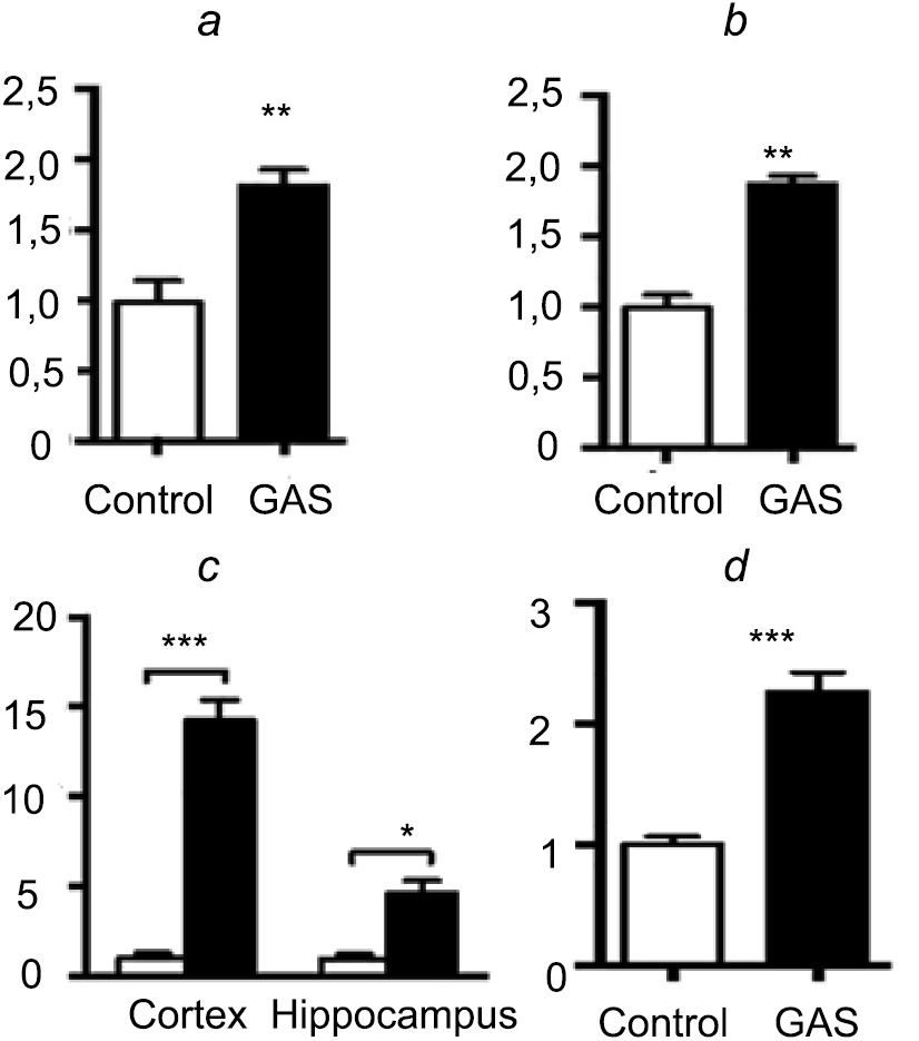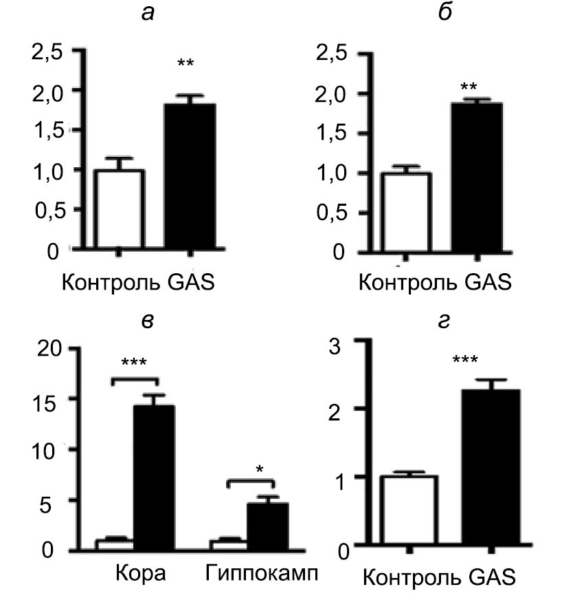 Рис. 14. Изменение уровней (разы) глиального фибриллярного кислого белка (а), индуцибельной синтазы оксида азота (б), миелопероксидазы (в) и MMP-9 (г) в мозге при инфекции штаммом A20 S. pyogenes у пациента [39].