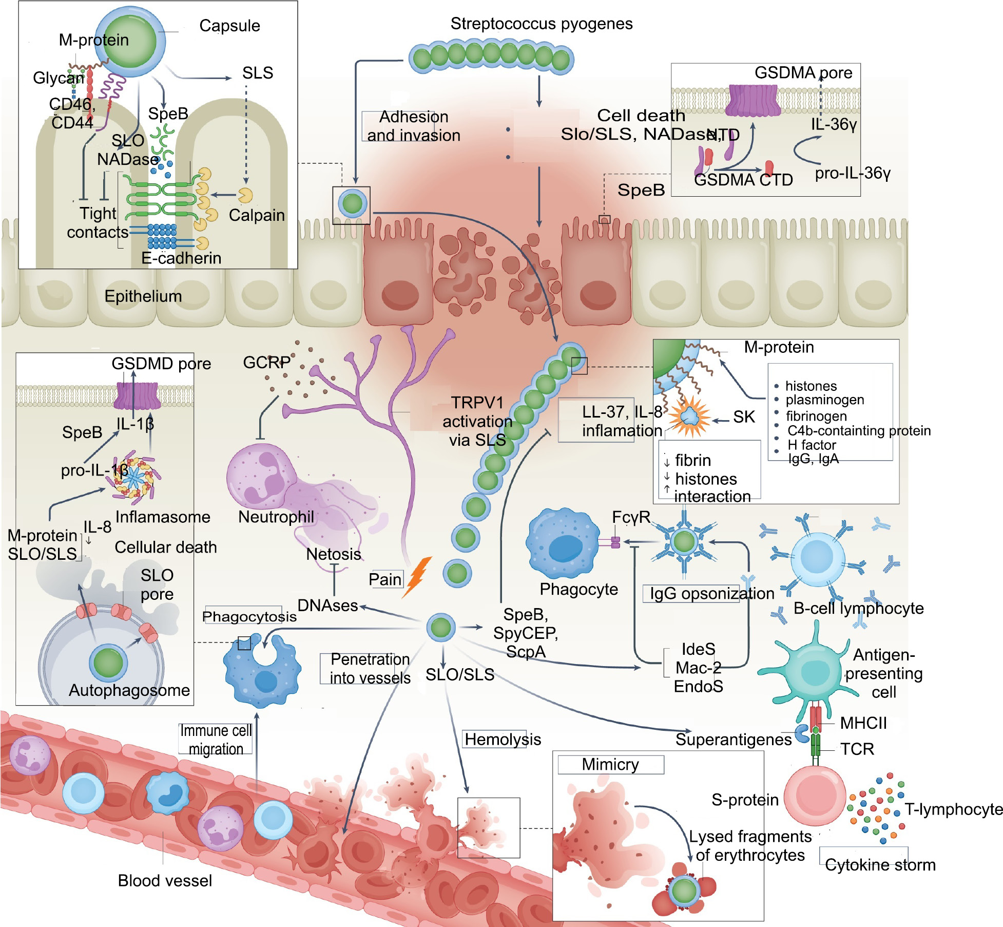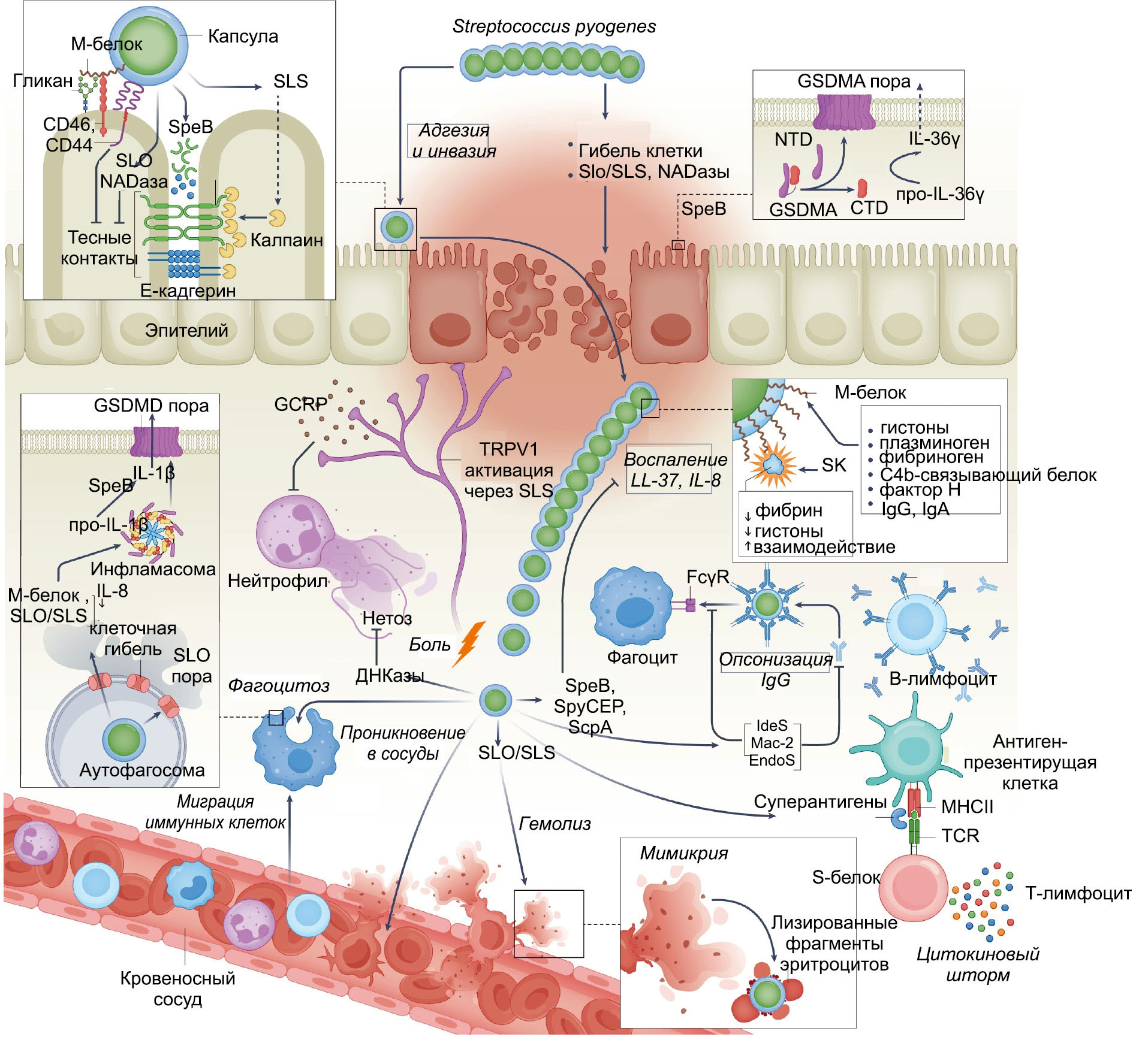 Рис. 16. Молекулярные и клеточные механизмы патогенеза S. pyogenes [26].