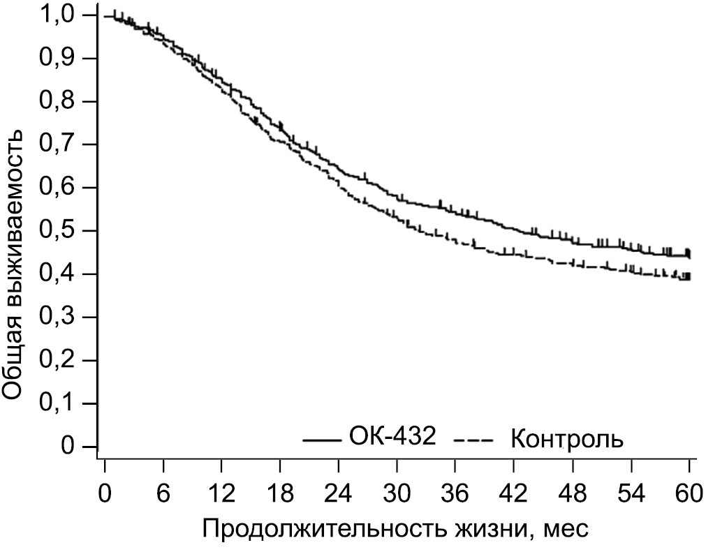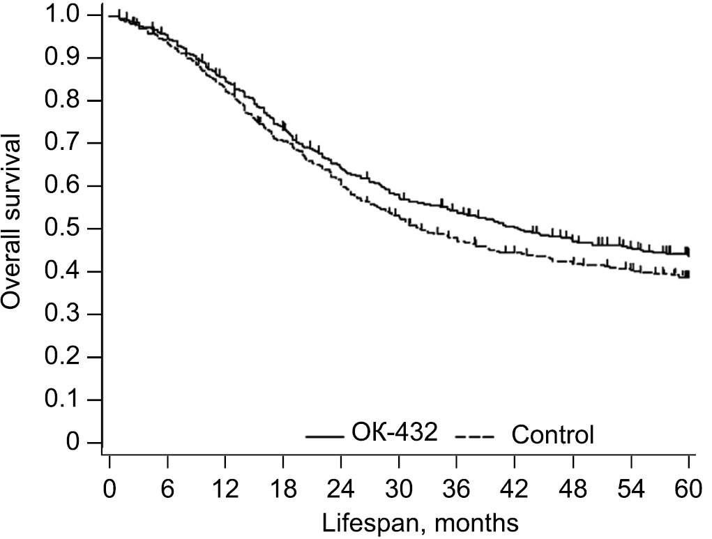 Рис. 17. Общая выживаемость пациентов с раком желудка, получавших иммунотерапию OK-432 [57].