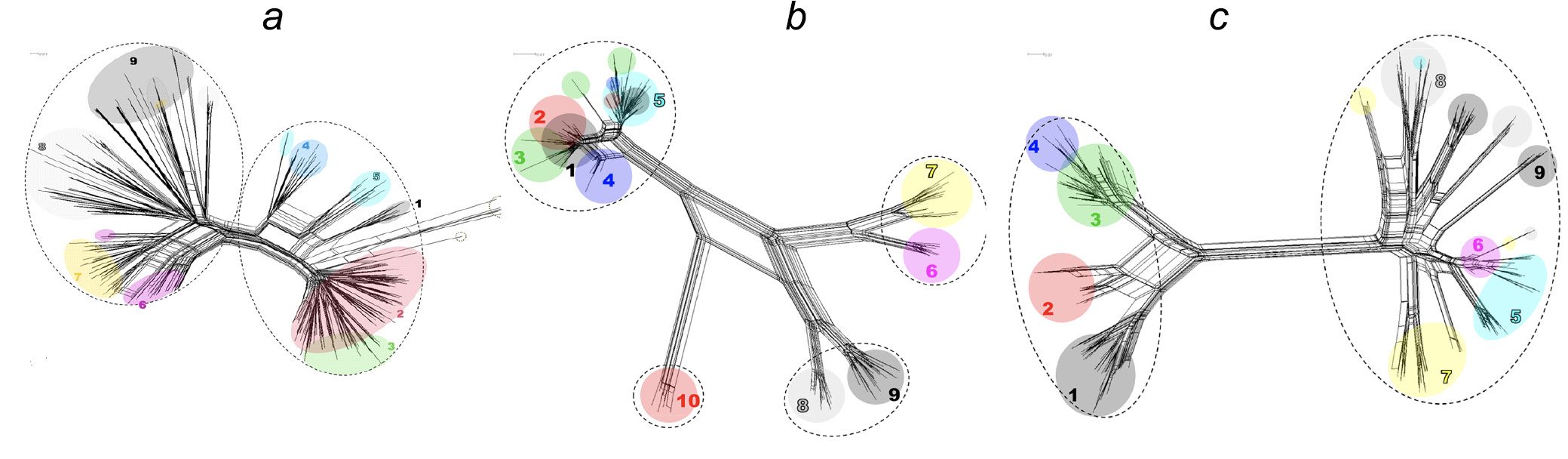 Рис. 6. Генетический сетевой анализ SplitsTree, включающий 537 генетических последовательностей с выделением кластеров M-белков [24].