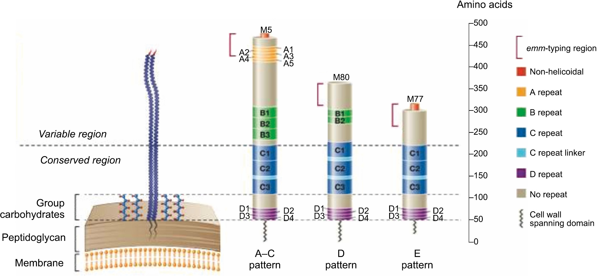 Длина белка M и размер повторяющихся и неповторяющихся доменов показаны в масштабе. Структуры A–C emm-типов представляют самые длинные M-белки с гипервариабельным доменом из 230 остатков. Белки D и E обладают гипервариабельным доменом из 150 и 100 остатков соответственно. Повторы «A» отсутствуют в подавляющем большинстве M-белков, имеющих D и E структуры. Повторы «B» присутствуют в большинстве A–C и D emm-типов, но отсутствуют в E-М-содержащих М-белках.