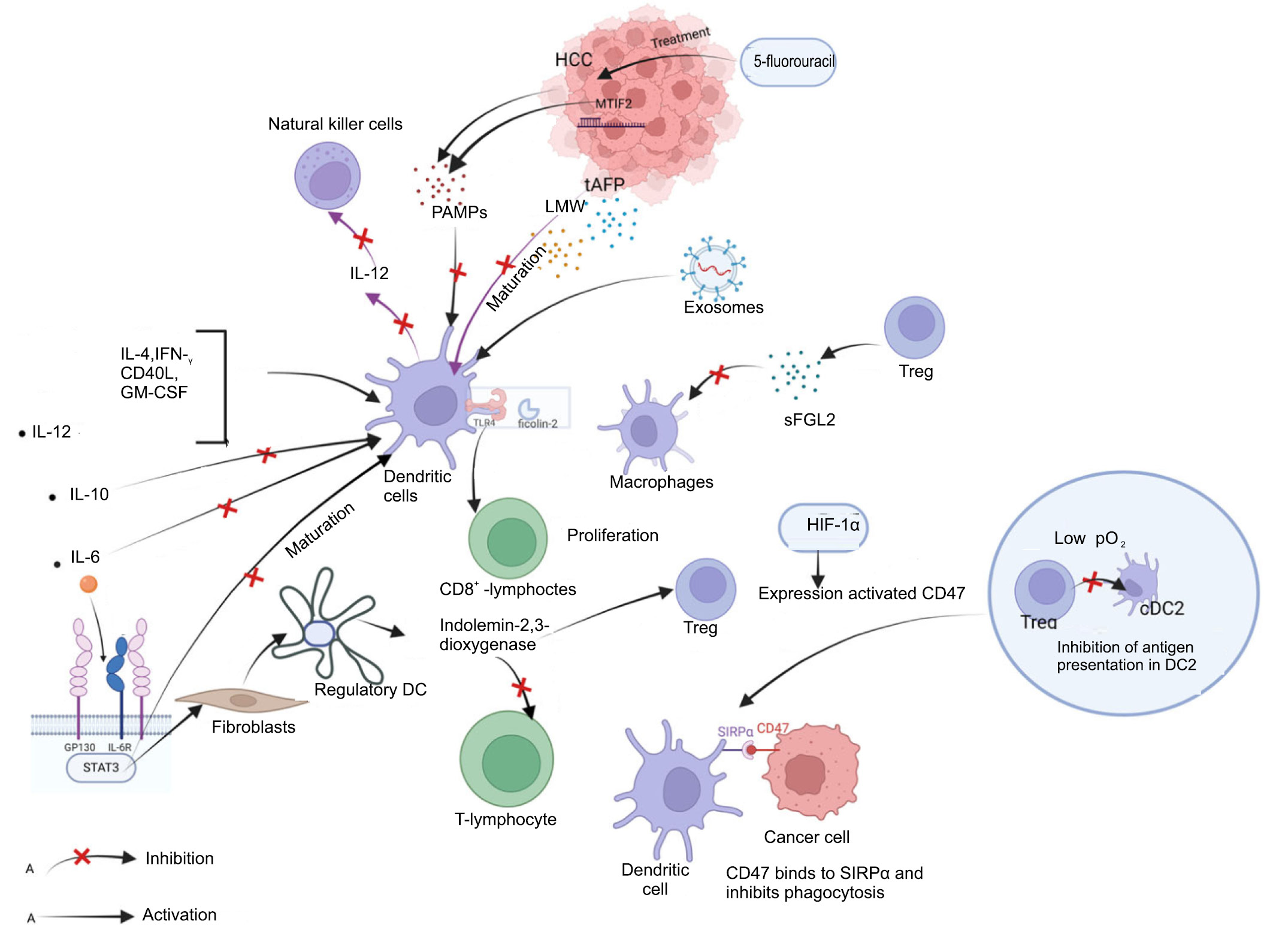 Кроме того, S. pyogenes стимулируют субпопуляцию интерферон-продуцирующих ДК и естественных киллеров. Активация этих клеток усиливает процессинг, презентацию опухолевых антигенов, TNF-α-индуцирующий TRAIL- и Fas-лиганд-зависимый апоптоз [46]. В свою очередь, плазмоцитоидные миедоидные ДК активируют опухольспецифичные цитотоксические CD8+-, CD4+-T-лимфоциты и секрецию ими цитокинов [40, 47]. Согласно работе W. Li и соавт. факторы, участвующие в активации ДК при гепатоцеллюлярной карциноме, представлены на рис. 15.