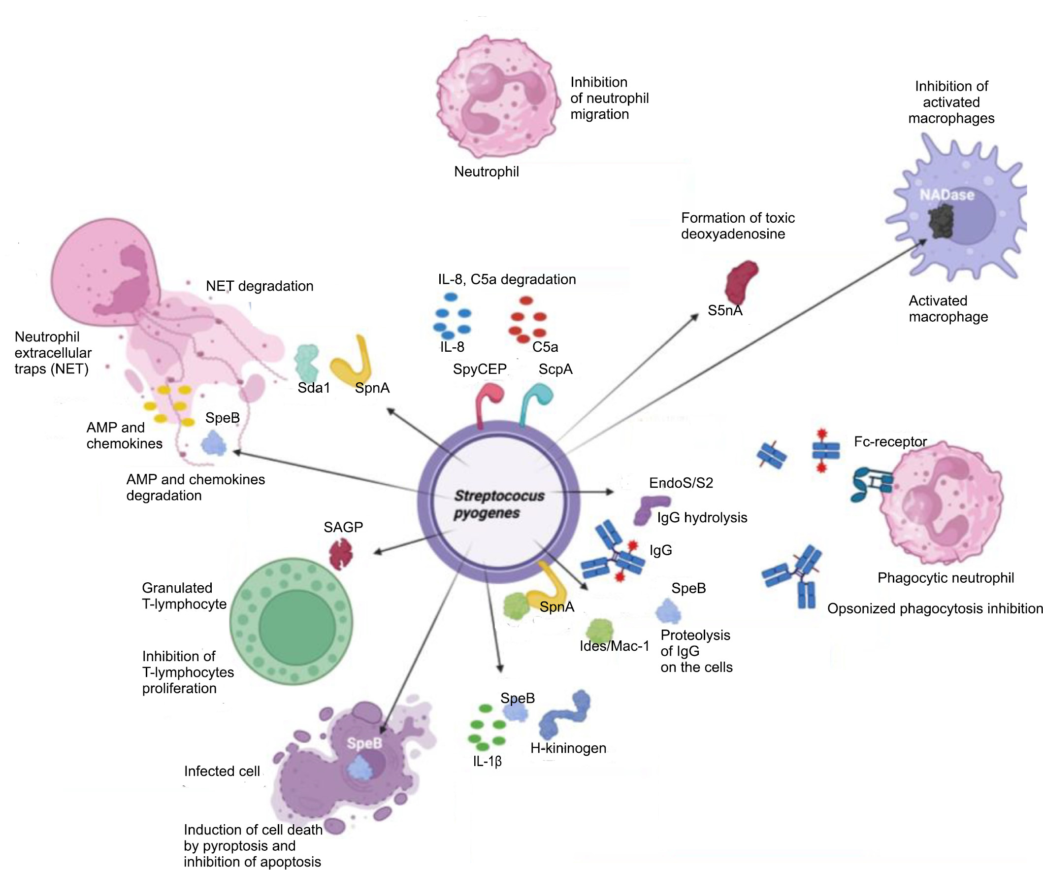 Ключевой фактор патогенности — кислый гликопротеин стрептококков (SAGP) связывается со IAP-сопряжённым рецептором, что активирует протеинтирозинфосфатазу, которая дефосфорилирует эпидермальный фактор роста и блокируют p42/44MAPK-сигнальный каскад, ингибируя тем самым пролиферацию опухолевых клеток A431 эпидермоидной карциномы [48]. S. pyogenes секретируют экзотоксины SpeB, SреA, обладающие цистеин-протеазной активностью и инактивирующие факторы воспаления IL-8, C5a, кателицидин LL-37, а также ингибируют хемотаксис нейтрофилов [26, 47, 49, 50]. ДНКазы SpnA и SdaI S. pyogenes подавляют образование внеклеточных ловушек нейтрофилов, SpeB супрессируют активность антимикробных хемокинов (рис. 16). Кроме того, SpeB способствуют образованию газдермина D, формирующего поры и индуцирующего пироптоз, а также ингибирующего IL-1β и H-кининоген, которые оказывают мощное провоспалительное действие [47]. Следовательно, секреция экзотоксинов стрептококками может ингибировать рост и развитие опухоли.