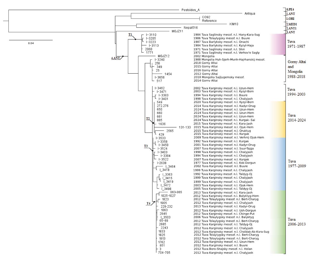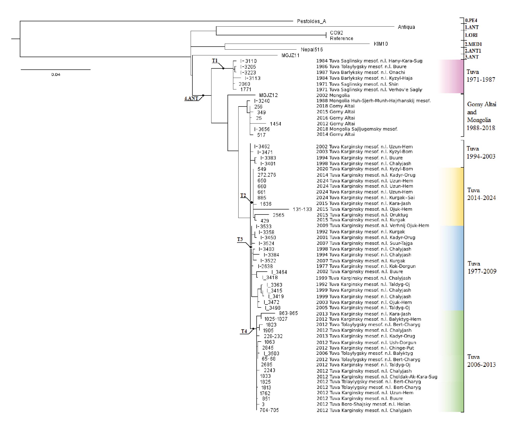 Discussion. Among the strains analyzed, the earliest representatives of the 4.ANT branch are strains of the T1 cluster from the TMPF. The population of strains from the Altai Mountains and Mongolia and the population of strains from the TMPF (1977–2024) are represented as separate sub-branches on the tree. The latter population is represented by polytomy and is characterized by pronounced clustering according to the spatial and temporal principle.
