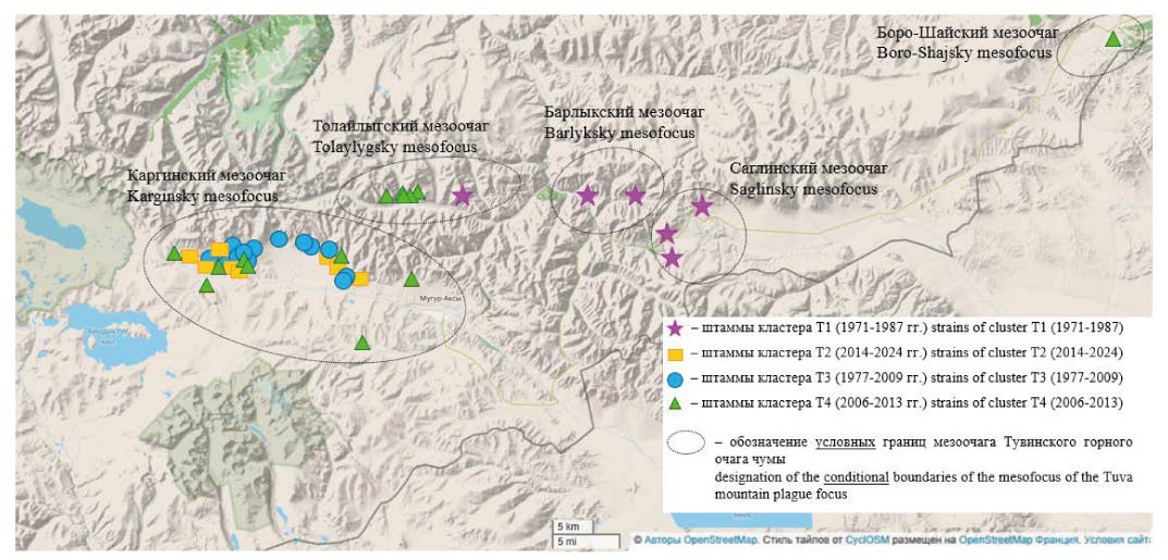 Results. According to SNP-analysis of Y. pestis strains of lineage 4.ANT from the TMPF, the presence of 4 phylogeographic groups was established: T1 (Saglinsky, Tolaylyg and Barlyk mesofoci, 1971–1987), T2 (Karginsky mesofocus, 2014–2024), T3 (Karginsky mesofocus, 1977–2009), T4 (Karginsky, Tolaylyg and Boro-Shai mesofoci, 2006–2013). Eight MLVA-genotypes of strains of 4.ANT lineage from Tuva and variable VNTR loci were identified: yp1290ms04, yp1935ms05, yp0559ms15, yp4042ms35, yp4425ms38, yp1108ms45, yp4280ms62, yp1580ms70.