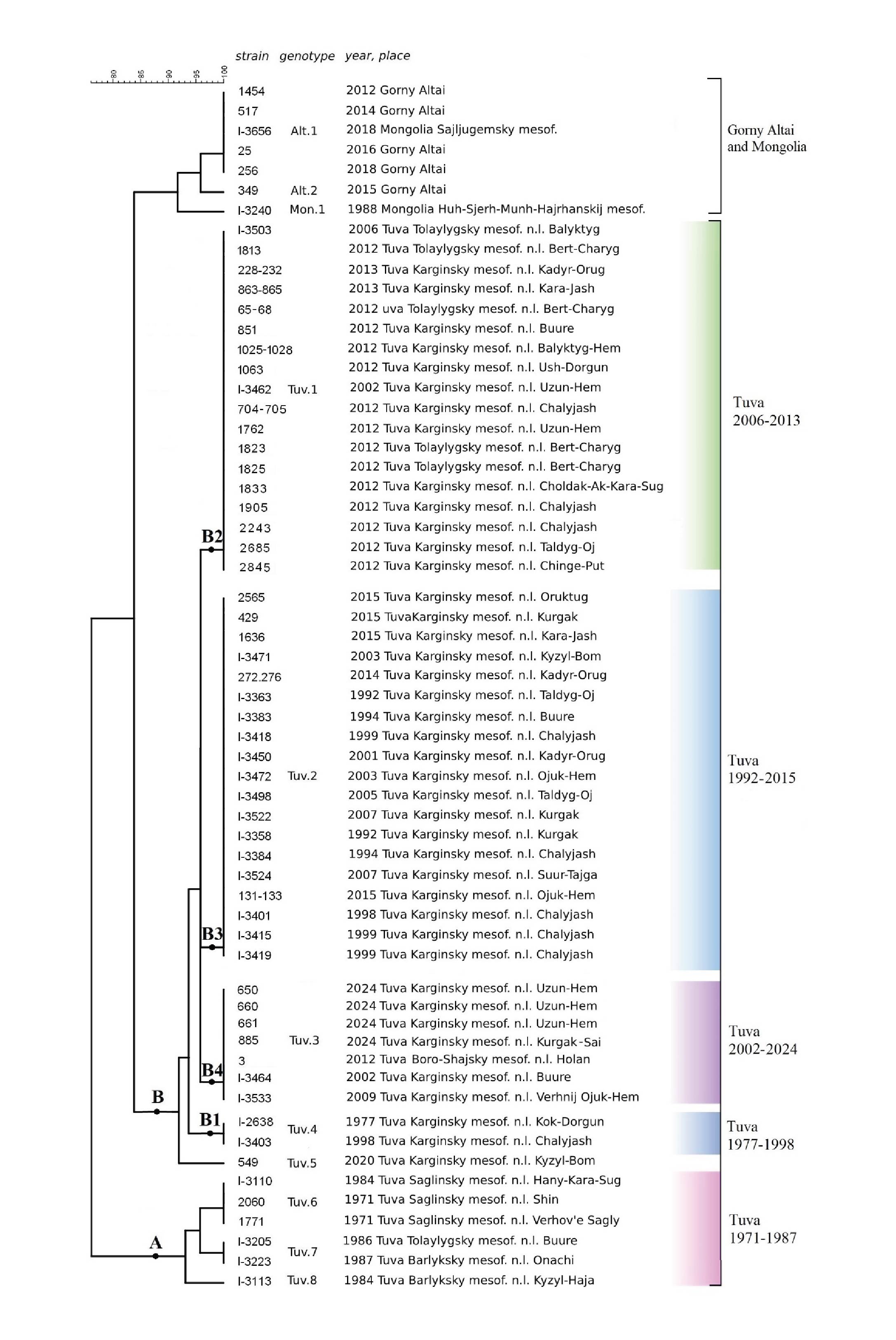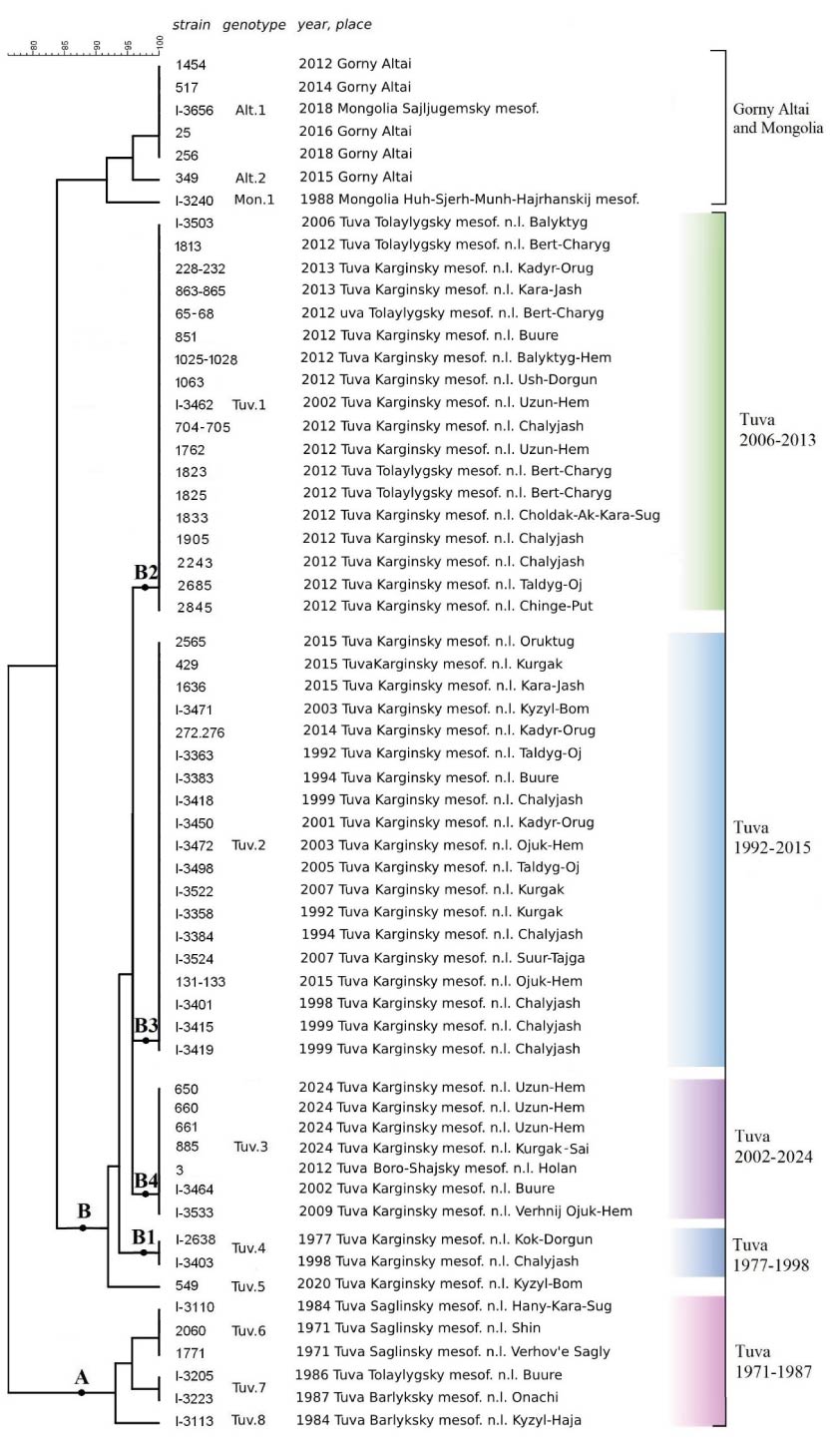 A separate cluster on the dendrogram was formed by strains from the Altai Mountains and Mongolia (genotypes Alt.1, Alt.2, Mon.1).