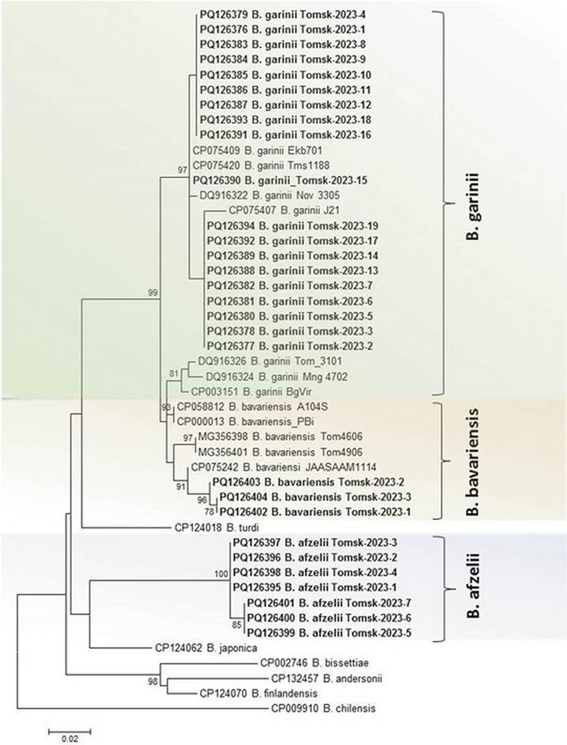 ДНК B. miyamotoi была обнаружена в 2,1% исследованных клещей рода Ixodes. Данный вид боррелий относится к возбудителям клещевых возвратных лихорадок, которые широко распространены в различных регионах мира, включая Россию [25–28]. С данным видом боррелий ассоциируются безэритемные формы ИКБ, при этом возбудитель способен вызывать тяжёлые формы заболевания, включая менингоэнцефалит, у людей с ослабленным иммунитетом, и микст-инфекции с другими возбудителями клещевых патогенов. Инфицированность иксодовых клещей B. miyamotoi обычно значительно ниже, чем боррелиями других видов и колеблется в пределах от 0,3–16% [27, 28]. В 2023 г. в иксодовых клещах рода Dermacentor нам не удалось выявить ДНК B. miyamotoi, хотя в 2021 г. в Томской области она обнаруживалась в 2% клещей D. reticulatus [3]. Филогенетический анализ 7 изолятов B. miyamotoi по фрагменту гена glpQ показал, что все они формируют достаточно компактную геногруппу в пределах азиатского субтипа и кластеризуются вместе с ранее обнаруженными вариантами на территории Томской, Новосибирской областей, Хабаровского и Красноярского краёв.