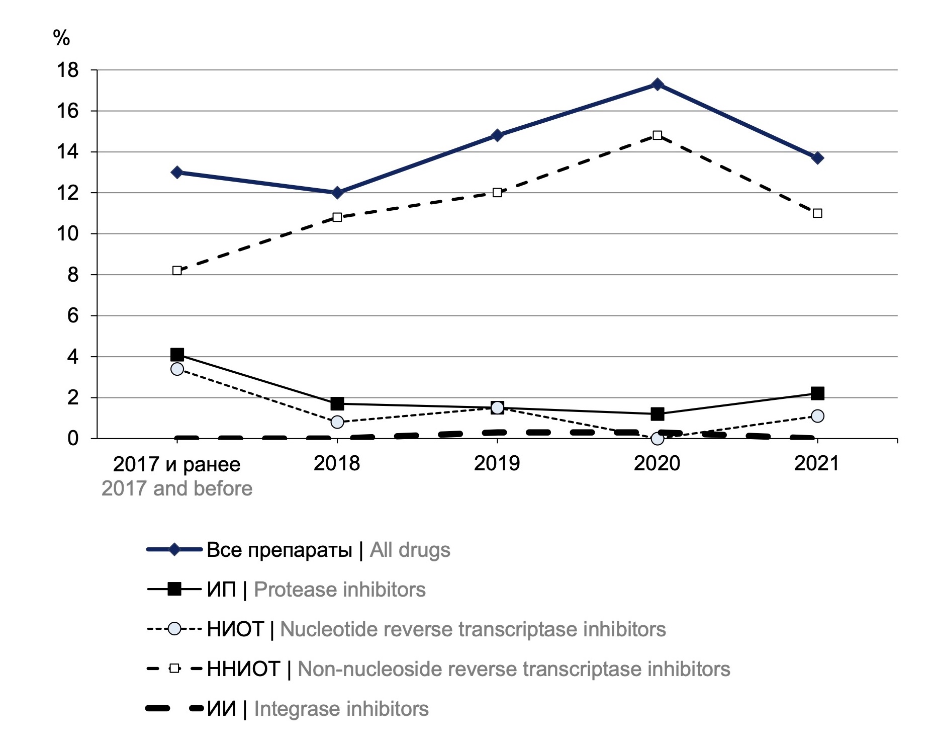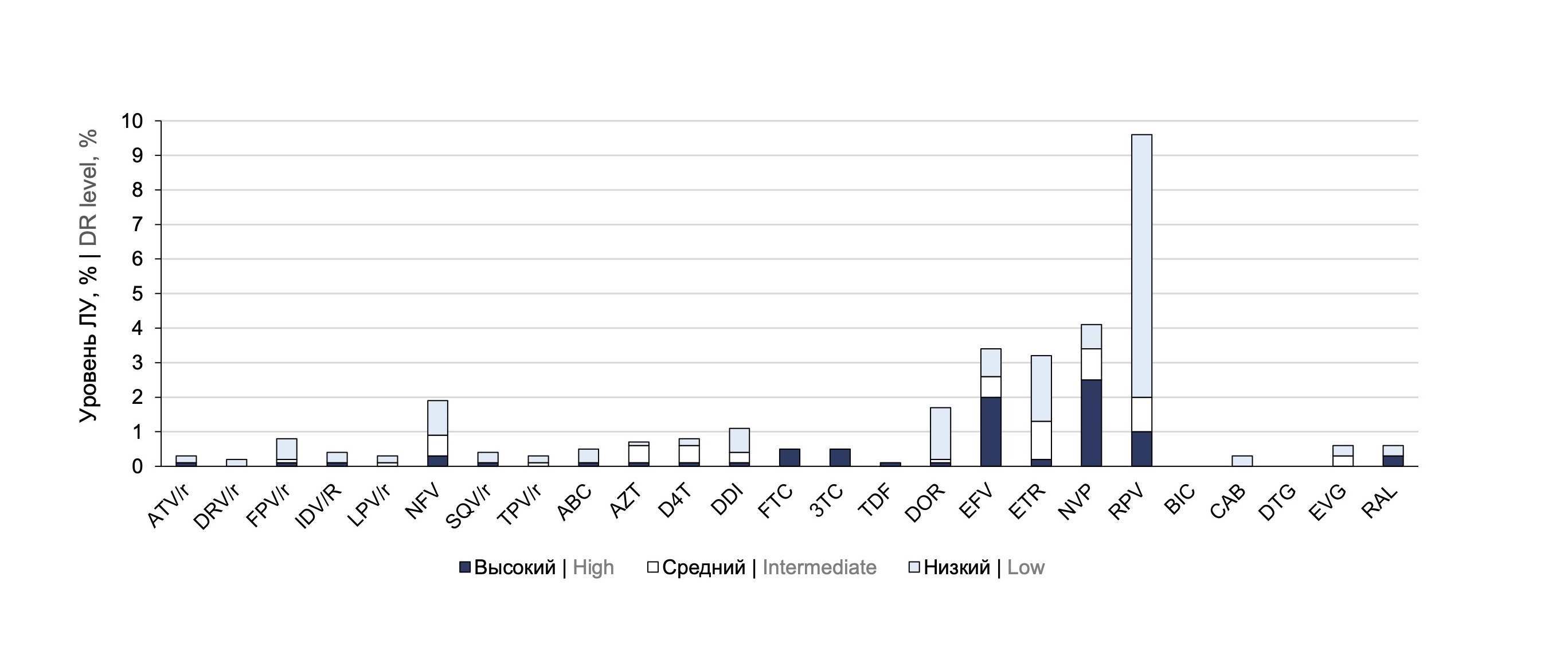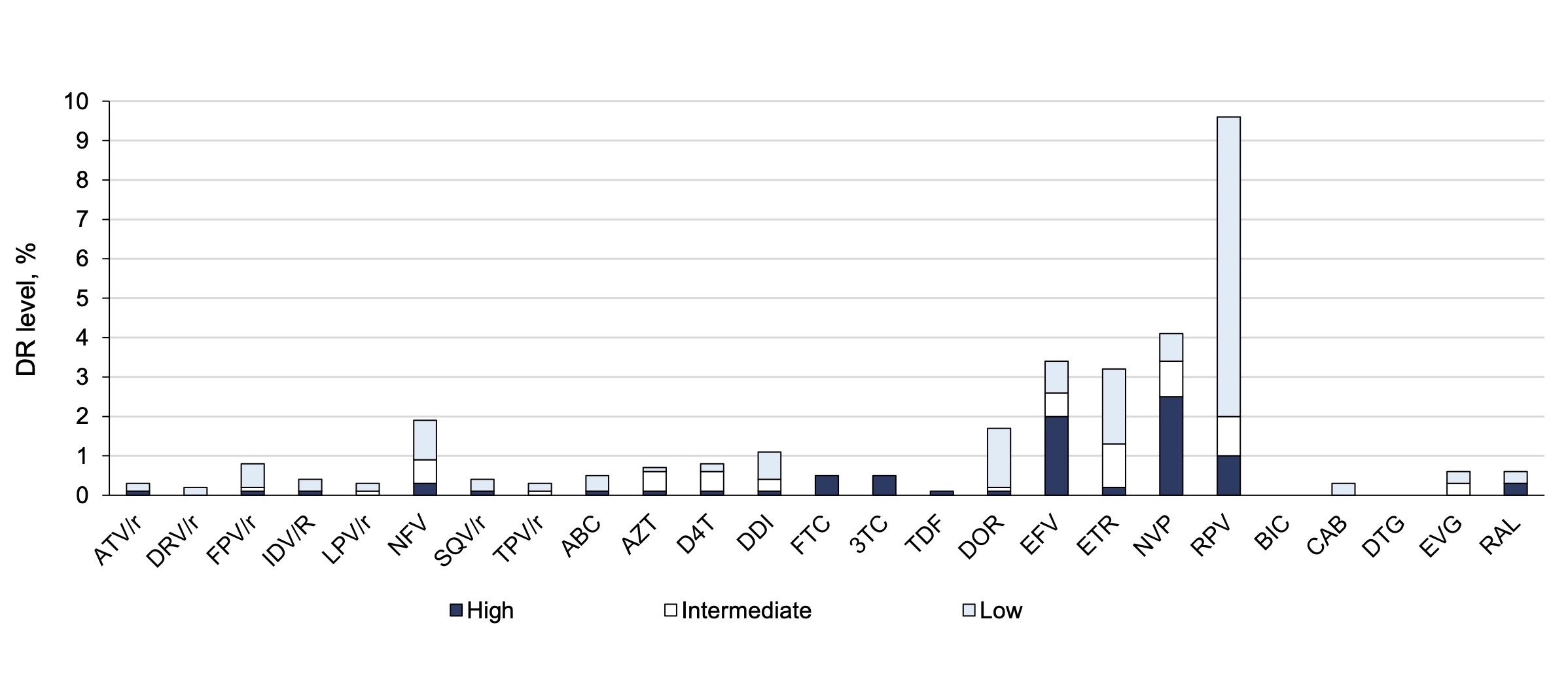 HIV DR was most frequently registered for the drug rilpivirine of the NNRTI class — in 9.7% of cases, but in 7.6% of cases it was low-level resistance. To other drugs of this class, nevirapine and efavirenz, DR was detected in 4.2 and 3.5% of cases, respectively, and it was mostly high-level resistance. Resistance to antiretroviral drugs of NRTI, PI and INI classes individually did not exceed 2%.