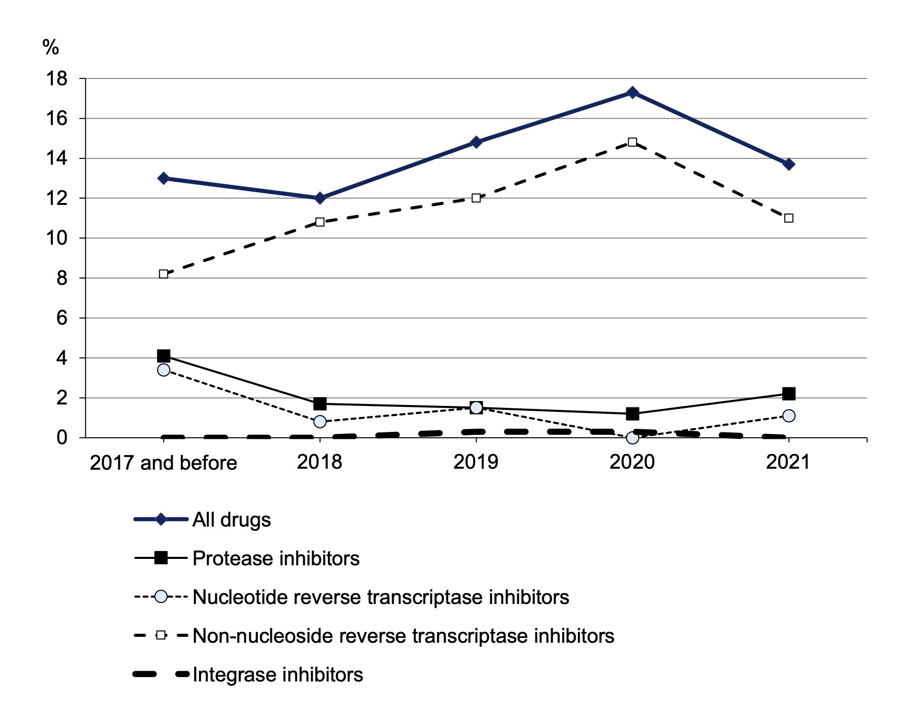 In this study, we researched the dynamics of the prevalence of DR to antiretroviral drugs of different classes depending on the year of the first positive immunoblot test. To obtain comparable cohort sizes, groups of patients with detected HIV infection were formed: up to and including 2017 (146 people), in 2018 (241 people), in 2019 (332 people), in 2020 (81 people) and in 2021 (182 people). The results of the analysis are presented in Figure 2. The dynamics of the overall prevalence of HIV-1 DR to antiretroviral drugs was largely driven by DR to NNRTI class antiretroviral drugs. During the study period, a slight upward trend of DR in the country was noted. It should also be noted that since 2020, a significant proportion of patients started to receive dolutegravir in the first-line therapy regimen of antiretroviral drugs from the INI group, and the share of such patients increased from 30% to 80% by the end of 2021 [8, 11]. This is possibly associated with the emergence of isolated cases of virus resistance to antiretroviral drugs of this class in 2019–2020.