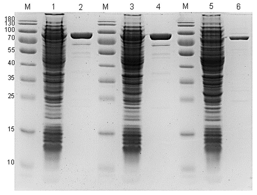 Плазмидную ДНК, содержащую ген химерного фермента, обрабатывали эндонуклеазами рестрикции NdeI и XhoI и полученный продукт рестрикции клонировали в плазмидный вектор pET16b+, предварительно обработанный теми же эндонуклеазами рестрикции. В результате были получены экспрессионные векторы, содержащие гены, которые кодируют следующие гибридные белки: Bst_Sso7d с молекулярной массой 75 кДа, Bst_Sso7d_mut4 с молекулярной массой 75,2 кДа и Btlv_Sso7d с молекулярной массой 75 кДа. Правильность нуклеотидной последовательности клонированных генов была подтверждена секвенированием.