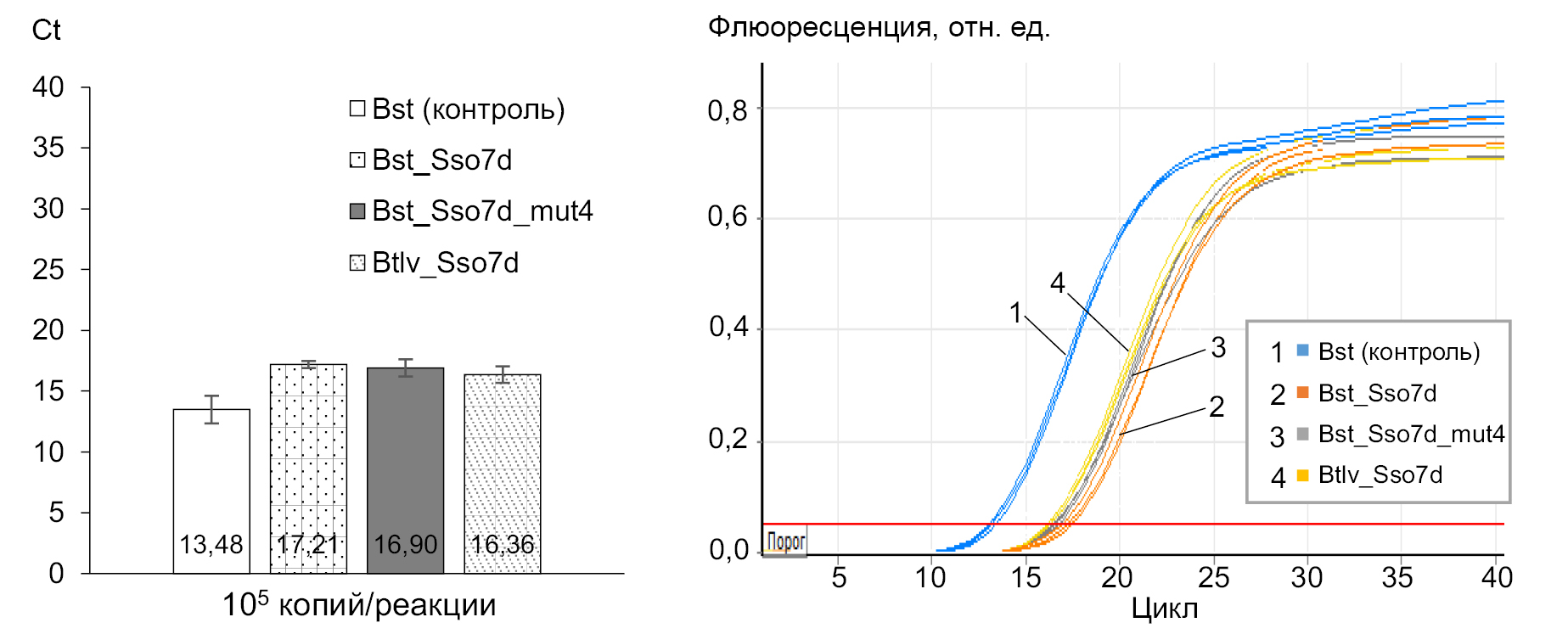Для оценки потенциальной возможности использования полученных химерных ферментов в составе новых наборов реагентов для диагностики инфекционных заболеваний, проводили тестирование на наборе реагентов «АмплиСенс SARS-CoV-2-IT» (РУ № РЗН 2021/14599). В качестве образцов использовали генетическую конструкцию, представляющую собой бактериофаг MS2 со специфической вставкой гена ORF1ab коронавируса. Реакционные смеси содержали 0,8 мкл тестируемых ферментов в концентрации 0,288 ЕД/мкл или такое же количество Bst-полимеразы без Sso7d-домена, а также ревертазу (MMLv). Каждый образец амплифицировали в 3 повторах на приборе «Rotor-Gene Q» («Qiagen»).