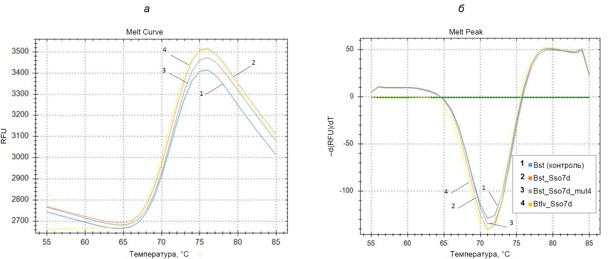 Устойчивость ферментов к температурному воздействию оценивали с помощью дифференциальной сканирующей флуориметрии в диапазоне 55–85°С по 1°С на шаг, продолжительность шага составляла 50 с, кривые плавления детектировались по каналу Fam на приборе «CFX 96» («Bio-Rad Laboratories»).