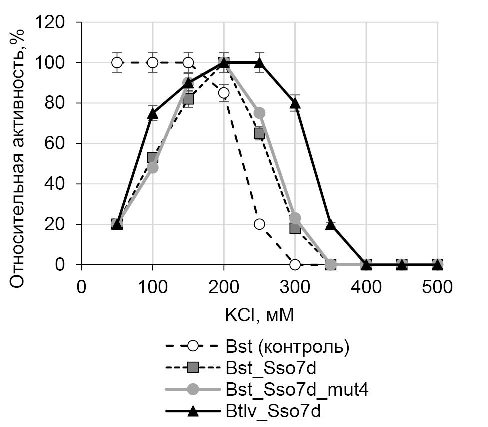 Модифицированные ферменты на основе Bst-полимеразы, содержащие ДНК-связывающий домен Sso7D: Bst_Sso7d и Bst_Sso7d_mut4, продемонстрировали сниженную устойчивость к присутствию в реакционной смеси цельной крови и мочи по сравнению с контрольным ферментом. В то же время фермент Btlv_Sso7d характеризуется более высокой устойчивостью к присутствию цельной крови (10 об. %), плазмы (1 об. %), мочи (10 об. %). Все ферменты сохраняют свою активность в присутствии муцина до 0,5 мг/мл.