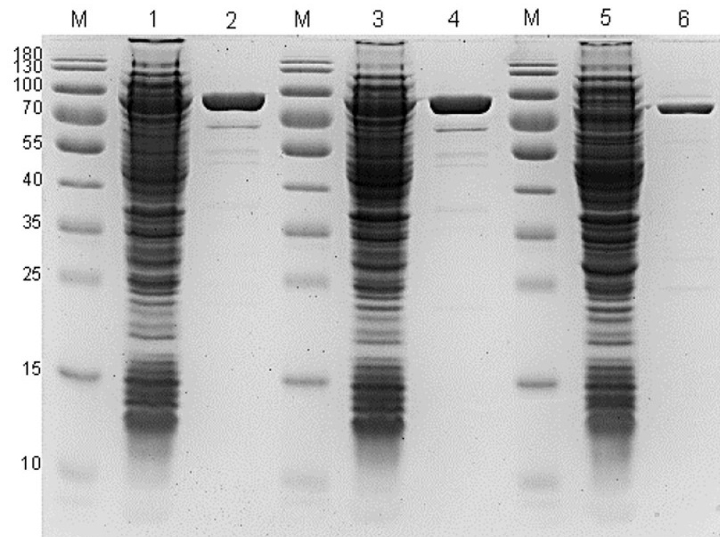 Plasmid DNA containing the gene of the chimeric enzyme was treated with the NdeI and XhoI restriction endonucleases, and the resulting restriction product was cloned into the pET16b+ plasmid vector, which had been pre-treated with the same restriction endonucleases. As a result, expression vectors containing genes that encode the following hybrid proteins were obtained: Bst_Sso7d with a molecular weight of 75 kDa, Bst_Sso7d_mut4 with a molecular weight of 75.2 kDa, and Btlv_Sso7d with a molecular weight of 75 kDa. The accuracy of the nucleotide sequence of the cloned genes was confirmed by sequencing.