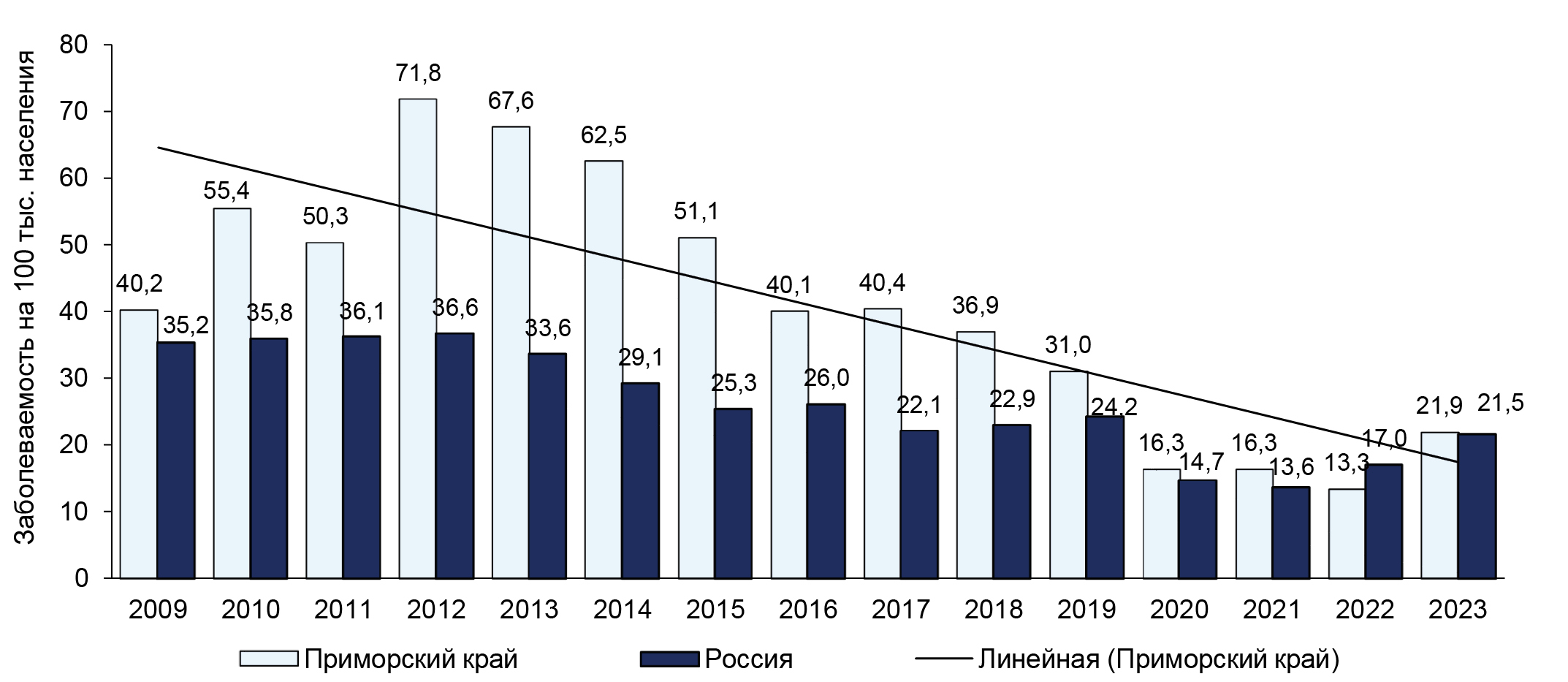 The period from 2009 to 2012 in the Primorsky Krai was characterized by an increase in the incidence of salmonellosis, with a peak registered in 2012 at 71.8 per 100,000 population. In the following years, a trend towards a decrease in morbidity was observed, and by 2022, its level had dropped to 13.3 per 100,000 population (the growth rate was –4.2), whereas in Russia, the incidence of salmonellosis was more stable (the growth rate was –3.4). At the same time, the incidence rates in Primorsky Krai exceeded the national data from 2009 to 2019, and starting from 2020, they almost leveled off (Fig. 1). In 2023, an increase in morbidity was observed both in Primorsky Krai and in Russia as a whole (up to 21.6 per 100,000 population).