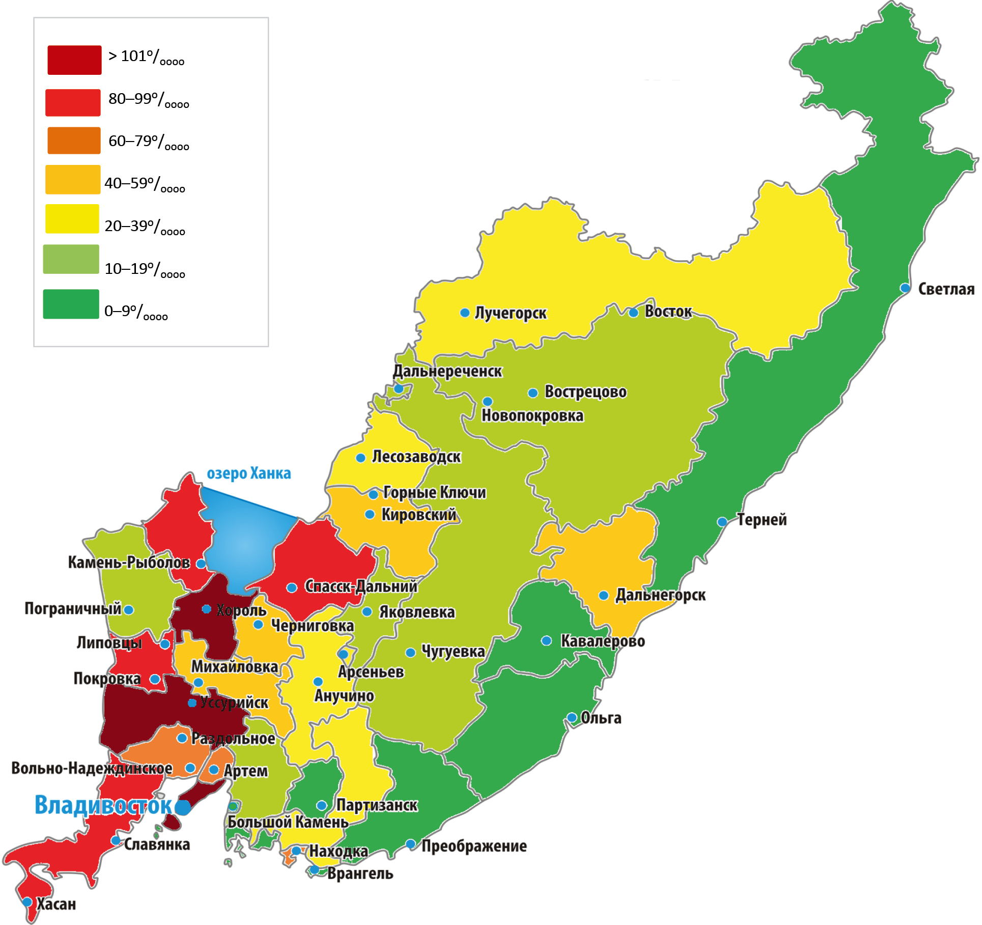 Before and during the COVID-19 pandemic, the lowest incidence of salmonellosis infections in the Primorsky Krai region was recorded in the municipal districts of Terneisky, Kavalerovsky, Lazovsky, Olginsky, Partizansky, and the city of Fokino (Fig. 2). It should be noted that during the peak of the pandemic, S. enterica strains were not isolated in these areas.