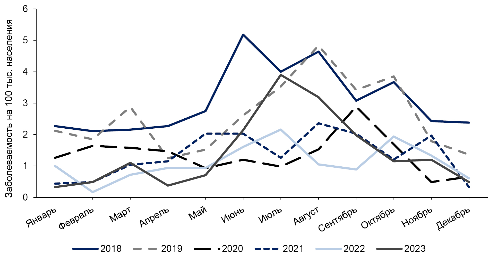 Fig. 3. Monthly dynamics of salmonellosis incidence in Primorsky Krai from 2018 to 2023.