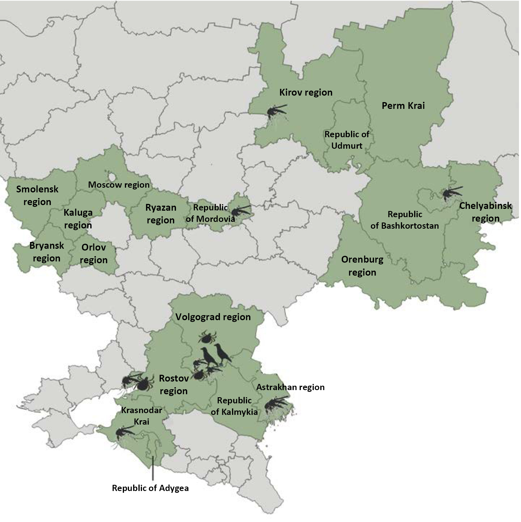 The largest number of samples from the total number examined came from the Southern Federal District (SFD) and the VFD. From the SFD, 340 birds, 9 small mammals, 45 frogs, 1279 mosquito samples, and 225 ixodid tick samples were tested. WNV RNA was detected in 20 samples of mosquitoes (individual infection rate was 0.06%), 3 samples of ixodid ticks (0.24%), and 6 samples of birds (1.76%). Vertebrates from the VFD in the studies were represented by 116 birds and 327 small mammals. No positive findings from vertebrates were detected. Out of 1,262 mosquito samples collected in this district, WNV RNA was detected in 3 (individual infection rate — 0.01%). The results of the studies on 198 samples of ixodid ticks are negative.