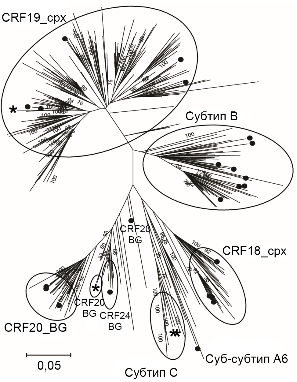 Phylogenetic analysis was performed by the maximum likelihood method using the GTR+G+I model of nucleotide substitutions in 500 independent constructions. Cluster analysis was performed with a genetic distance threshold of 4.5% and bootstrap support of more than 90%. Sequences of the studied collection that formed clusters are indicated by asterisks, those that did not are marked with black circles.