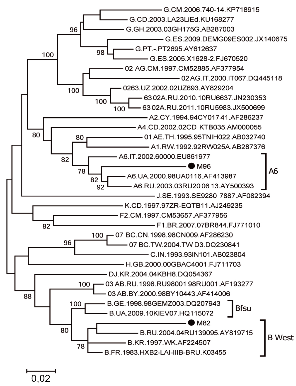 Phylogenetic analysis was performed using the maximum likelihood method with the HKY+G model of nucleotide substitutions and bootstrap support of 500. Sequences of M82 and M96 are indicated by black circles. Sub-branches formed by viruses of sub-subtype A6 and genetic variants Bwest and Bfsu are highlighted by frames.