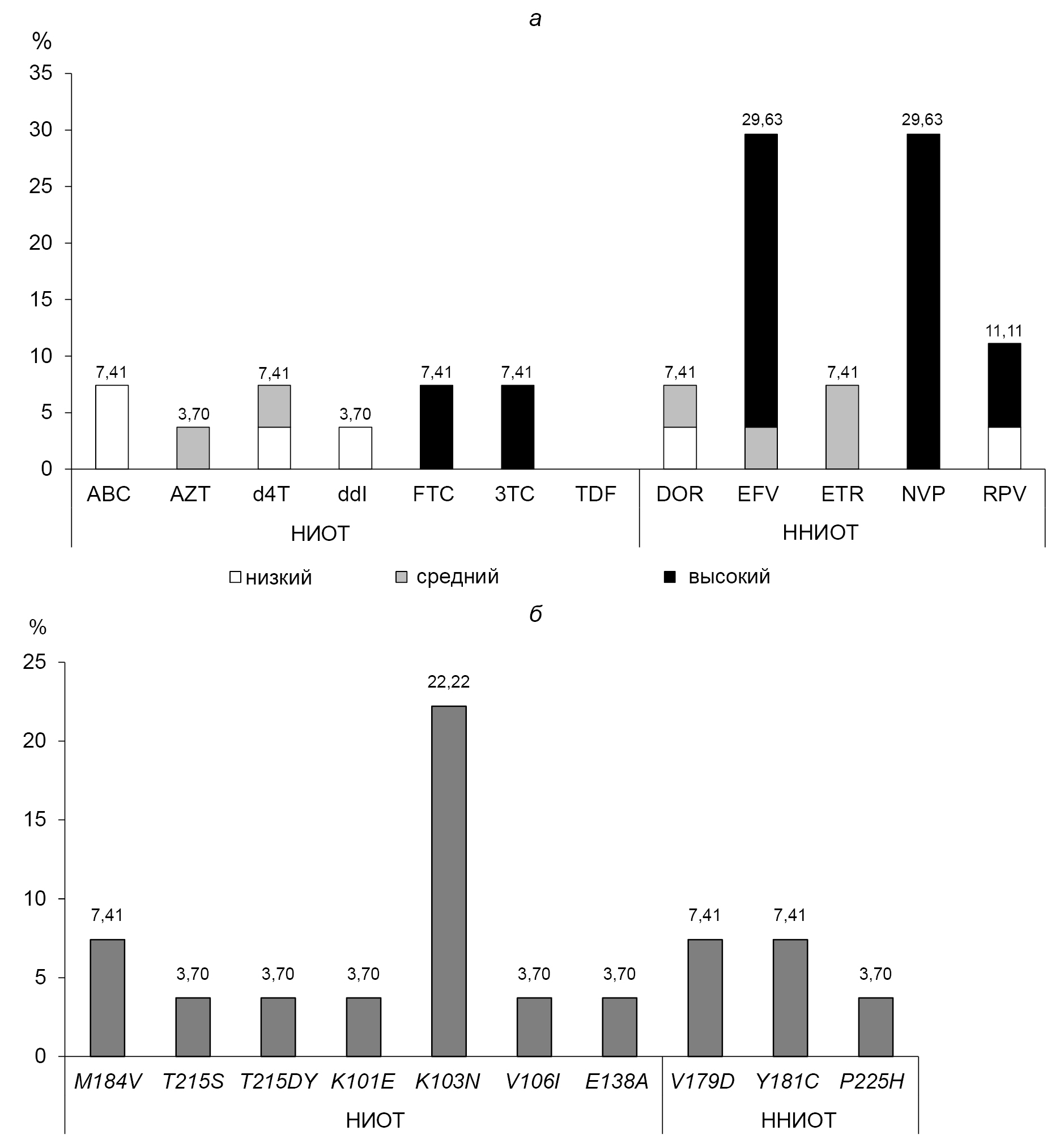 Fig. 3. Results of the analysis of occurrence frequency for drug resistance (a) and drug resistance mutations to HIV-1 inhibitors of the NRTI and NNRTI classes (b).