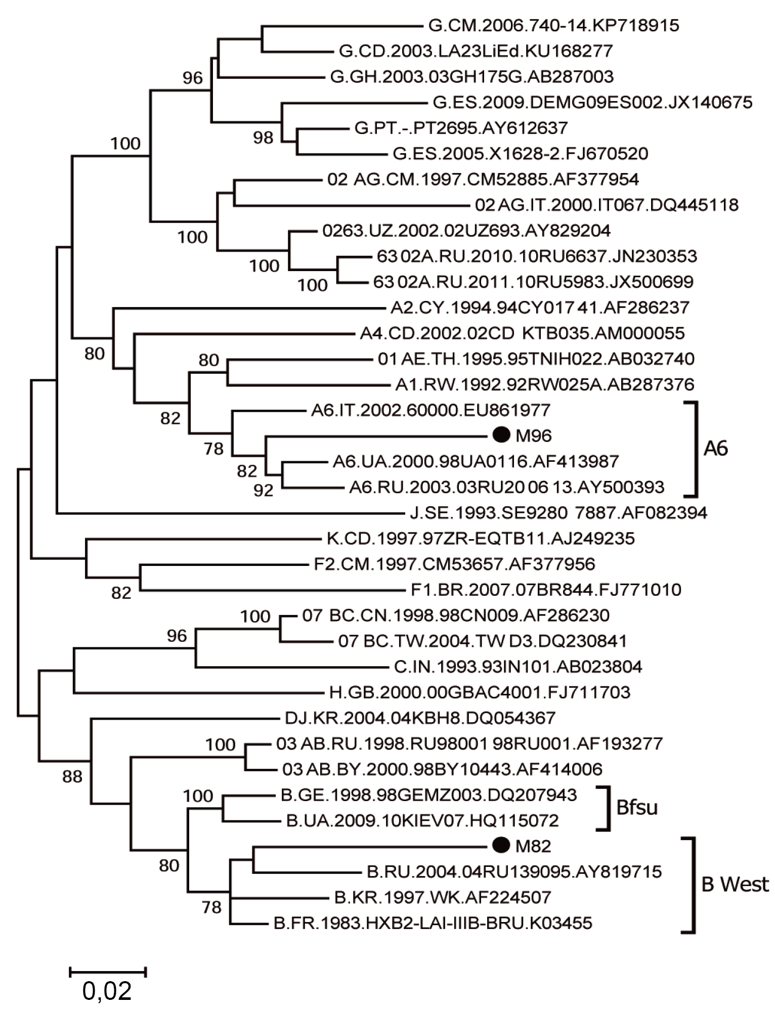 Fig. 2. Results of phylogenetic analysis of the pol gene fragment (positions 2253–3353) nucleotide sequences of HIV-1 samples from patients M82 and M96, presumably belonging to genetic variants circulating in Russia.