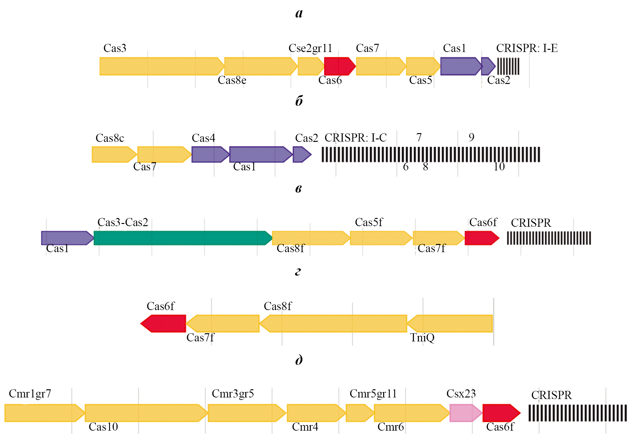 Next, the presence of the CRISPR–Cas system was investigated. This system was not found in the genomes of ctxAB–tcpA+ strains, while among the ctxAB–tcpA– strains, 35 isolates were identified that have a Class 1 Type 2 CRISPR–Cas system — Types I and III. Type I was represented by three subtypes: I-E, I-F, I-C, while Type III was represented by one (III-B). The largest number of strains (20 isolates) were found to have a subtype I-E CRISPR–Cas system, of which 10 isolates had only this subtype, while the others had additional systems. Thus, strain V. cholerae 617, in addition to I-E, had 2 more systems (Table). It should be noted that the I-E system structure was canonical in all strains and consisted of 8 cas genes (cas3, cas8e, cse2, cas6, cas7, cas5, cas1, cas2) (Figure, a).