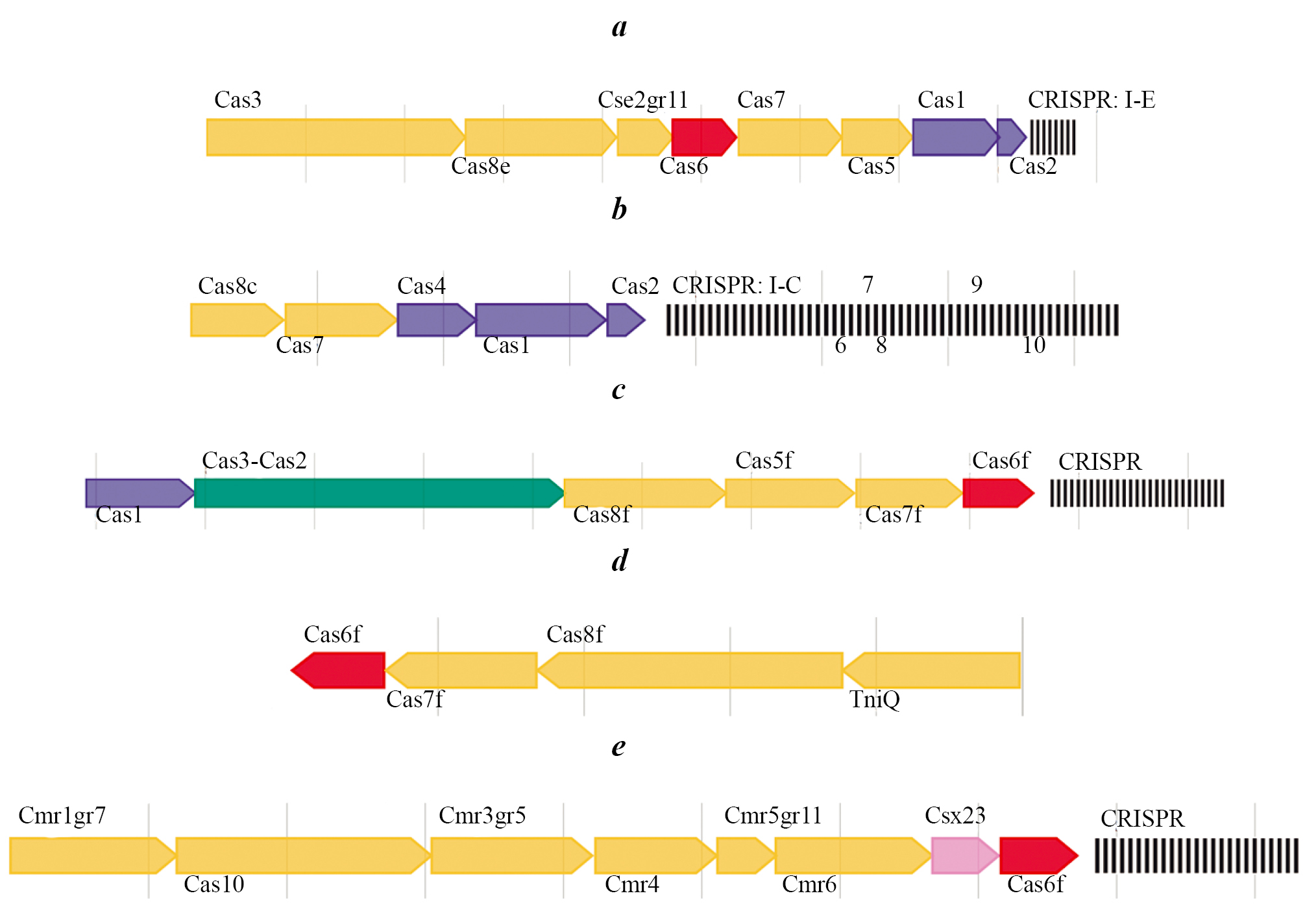 a — canonical subtype I-E, present in V. cholerae strain 29; b — subtype I-C of V. cholerae strain M1526; c — subtype I-F of V. cholerae strain 617; d — subtype I-F mini of V. cholerae strain M1426; e — subtype III-B of V. cholerae strain M1320. The spacers (CRISPR) are marked by black vertical lines on the right.