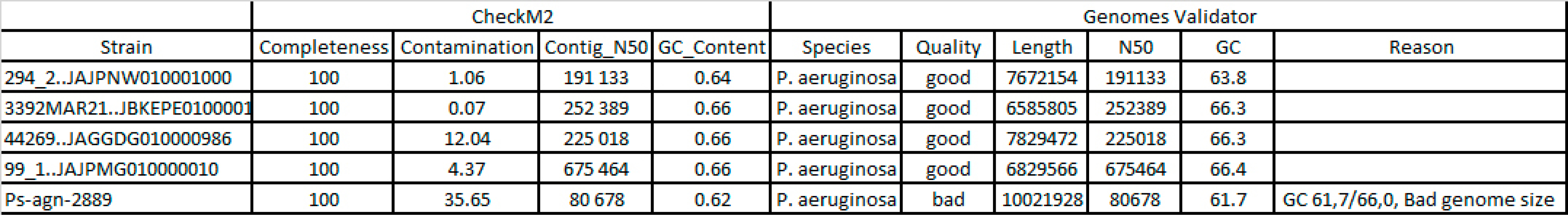 The program was validated on a sample of 108 whole-genome sequences of P. aeruginosa strains. Following validation, genomes of good (63%), medium (29%), and poor (8%) quality were identified. Further analysis identified 37% of the genomes analyzed (of medium and poor quality), which can help avoid errors in subsequent calculations using bioinformatics methods. The average N50 value among the sample was 1,250,527.