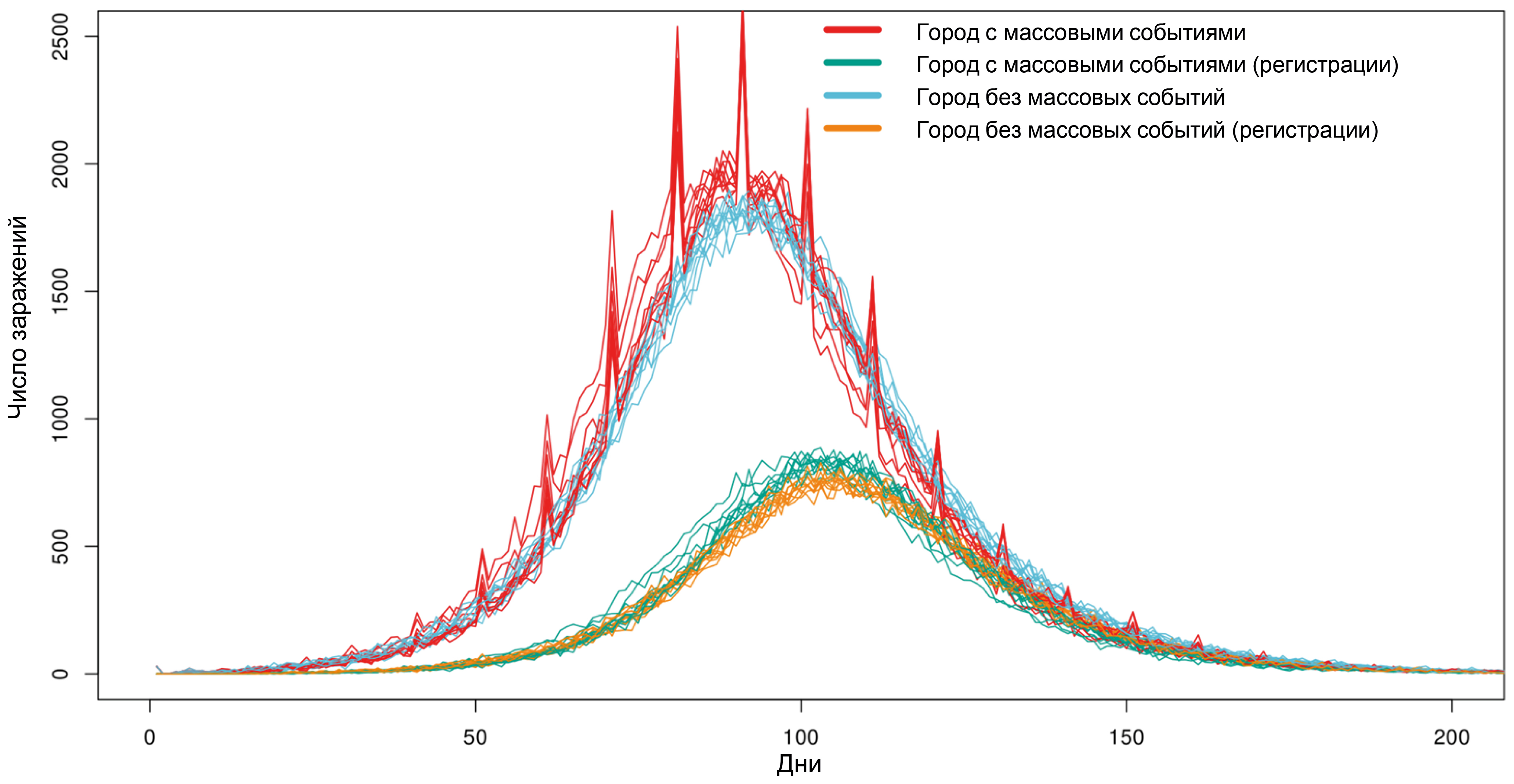 Results. Computational experiments have shown that due to individual variability in the dynamics of infection development and the specifics of disease registration, even mass events, while leading to an actual increase in the number of infected individuals, do not have a significant impact on the shape of the curve of registered disease incidence. It has been shown that intercity traffic flows at a level of 0.1% of the population per day have a minimal effect on the dynamics of the epidemic's development, while the effect of a 1% population outflow per day sharply reduces the effect of strict anti-epidemic measures implemented in only one particular city. Using the example of the Voronezh region, the transition from the Delta variant to Omicron in early 2022 was modeled, and a high degree of correlation was shown between the model dynamics and the actual ratio of virus variants observed.