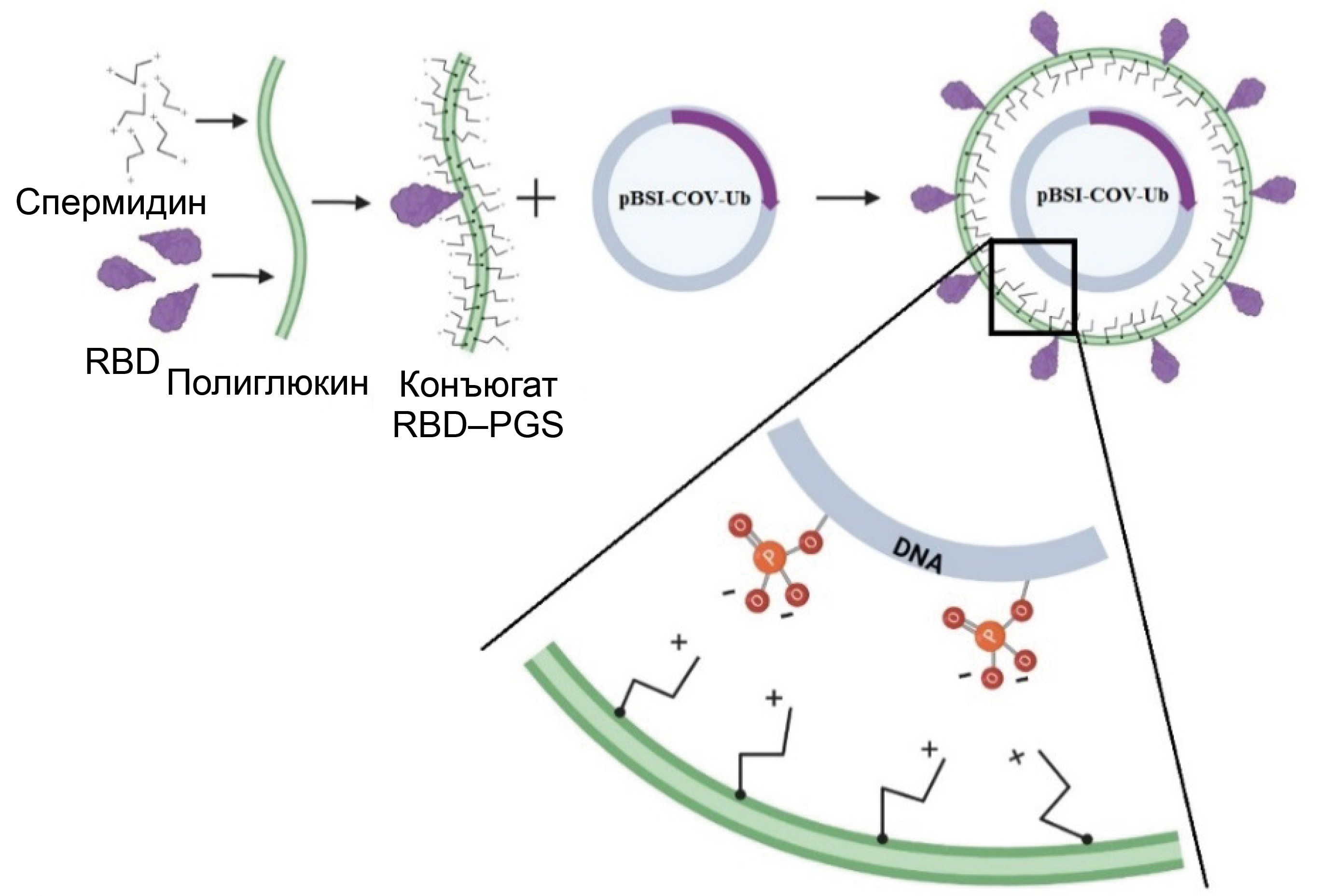 Materials and methods. To create the DNA vaccine (pBSI-COV-Ub), we used a strategy of designing an artificial polyepitope immunogen consisting of conserved immunodominant fragments of various structural proteins of the SARS-CoV-2 virus, containing a large number of T-lymphocyte epitopes: helper and cytotoxic. The recombinant RBD protein was conjugated with the polycation PGS, and upon mixing it with DNA, it formed the vaccine complex CCV–BSI, whose immunogenic properties were investigated in this work.
