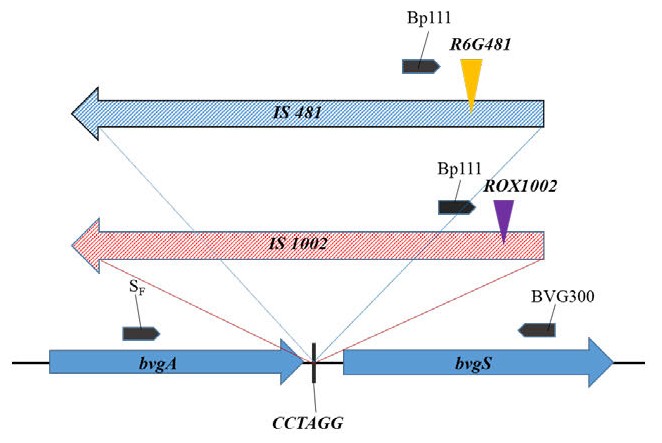 Introduction. The two-component BvgAS system regulates the transcription of the pathogen's virulence genes and plays a key role in the pathogenesis of whooping cough, an anthroponotic infectious disease. Currently, the factors affecting the BvgAS system of Bordetella pertussis bacteria in the human organism have not been studied in practice. It is known that disruption of the bvgAS operon structure leads to phase modulations and changes in virulence. IS-elements intergation into the bvgAS operon and other virulence genes of B. pertussis bacteria is important mechanism in regulating their expression, potentially leading to the long-term persistence of this pathogen in the human body.