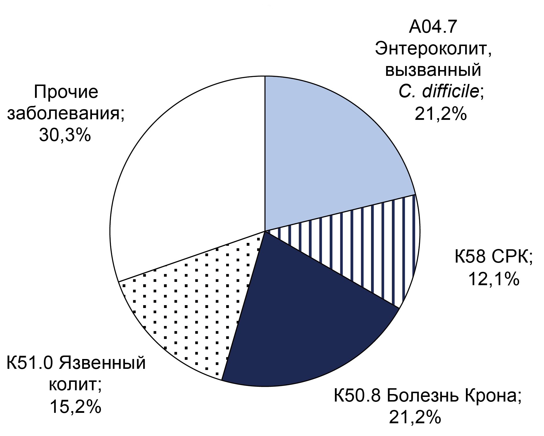 The aim of the study is to investigate the frequency of detecting C. difficile (both toxigenic and non-toxigenic strains) in patients admitted to the gastroenterology department of the Yu.M. Lopukhin Federal Scientific Clinical Center for Physical and Chemical Medicine of the Federal Medical Biological Agency of Russia in 2021–2023 with diarrhea syndrome and other established diagnoses.