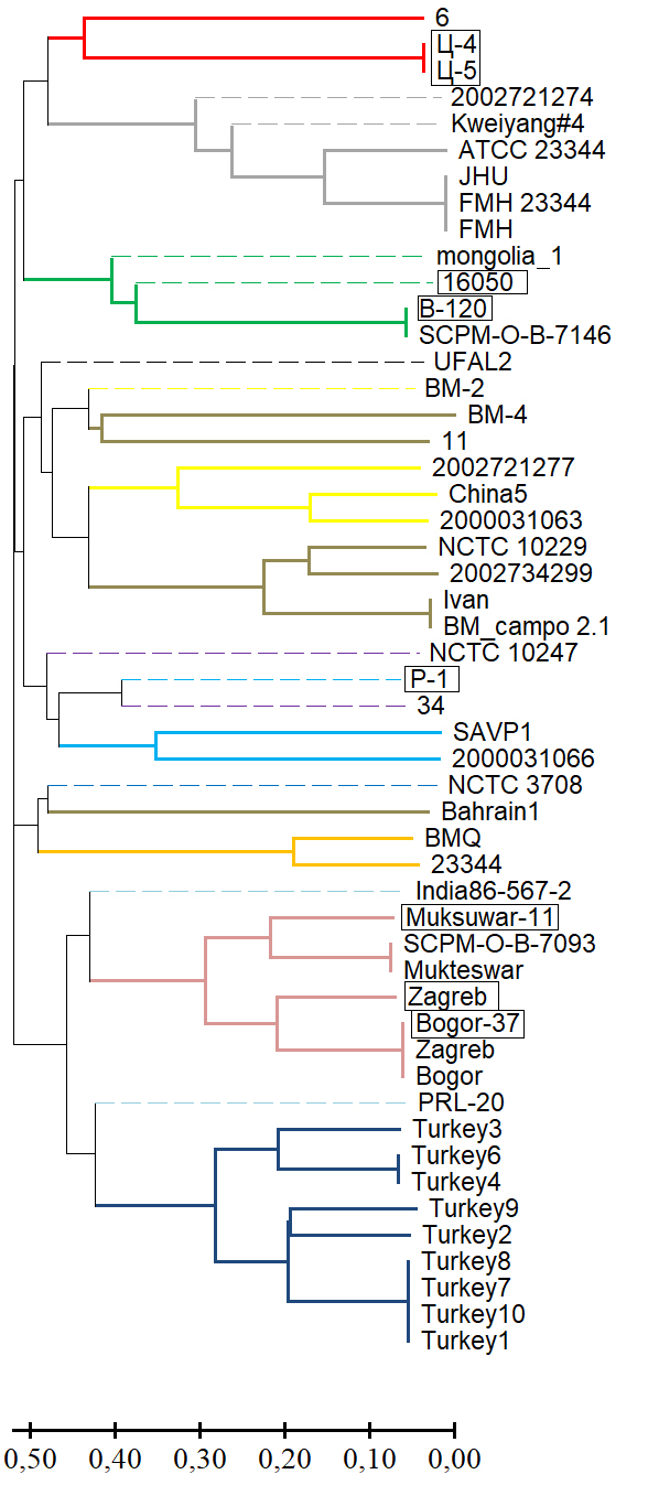 Results. Genotyping B. mallei using the MLVA-6 scheme failed to determine in silico VNTR profiles of 13 strains from the GenBank NCBI database for one or more loci due to low read coverage of the corresponding genomic regions or their complete absence (null alleles). The effective number of alleles (ne) and the polymorphic information content (PIC) index for the MLVA-6 scheme loci ranged from 3.842–8.103 and 0.740–0.877, respectively. The potential for including the VNTR locus BPSS1974#I in this scheme was determined based on the molecular stability of the motif within it and a high values for ne and PIC, which were 4.299 and 0.767, respectively. VNTR profiles of the collection strains at locus BPSS1974#I were identical to the corresponding strains in the GenBank database. The results of the cluster analysis using a combined MLVA-6 scheme and the BPSS1974#I locus were consistent with the phylogenetic reconstructions obtained using other molecular genetic methods.