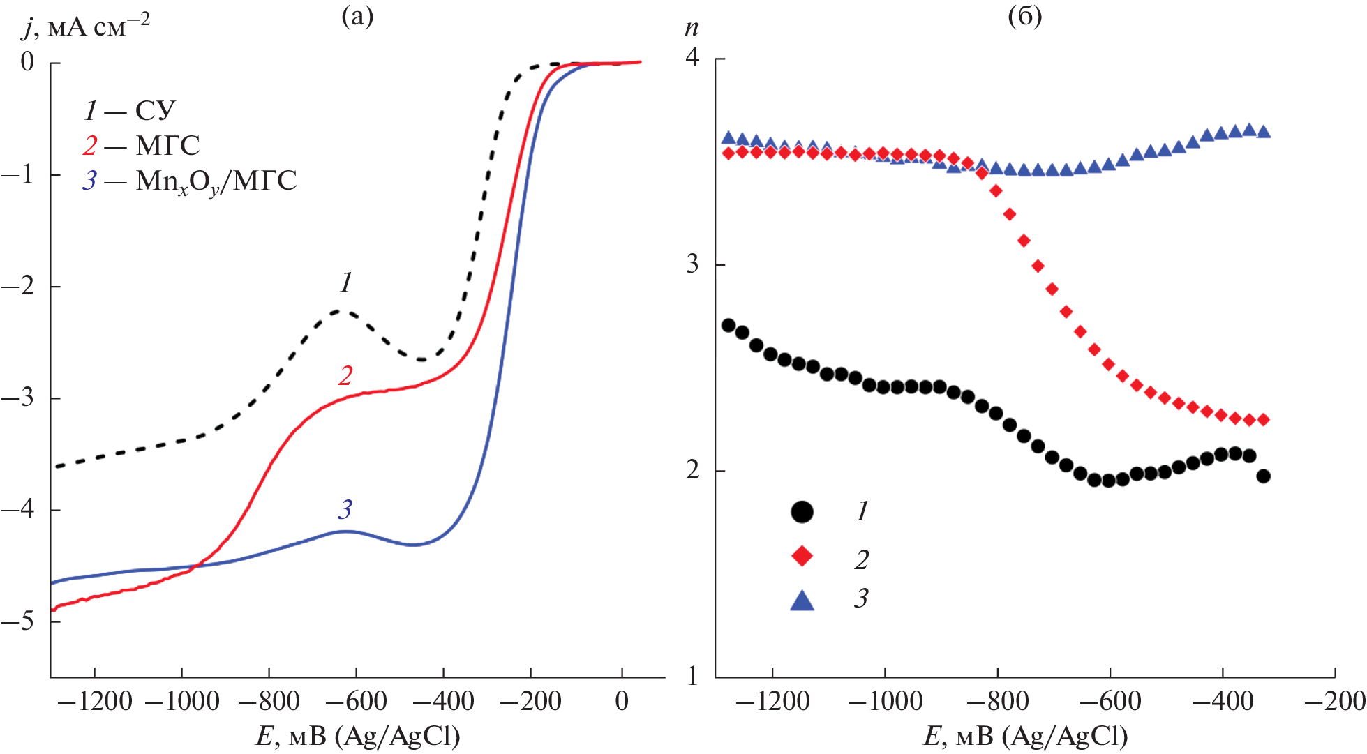 Методом плазмоэлектрохимического расщепления графита в одностадийном процессе синтезирован нанокомпозит, представляющий собой малослойные графеновые структуры, поверхность которых декорирована наночастицами оксидов марганца. Установлено, что данный материал обладает высокой электрокаталитической активностью в реакции восстановления кислорода благодаря присутствию марганца в степенях окисления +2 и +3, а также карбонильных (хинонных) функциональных групп на поверхности графеновых структур.